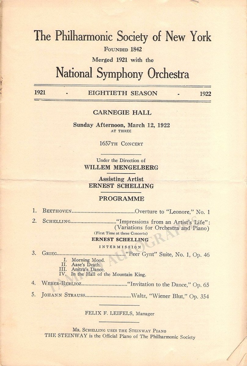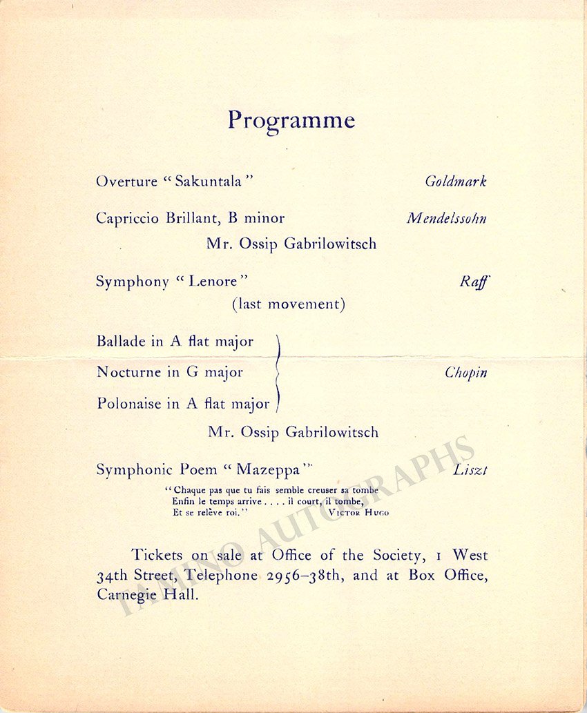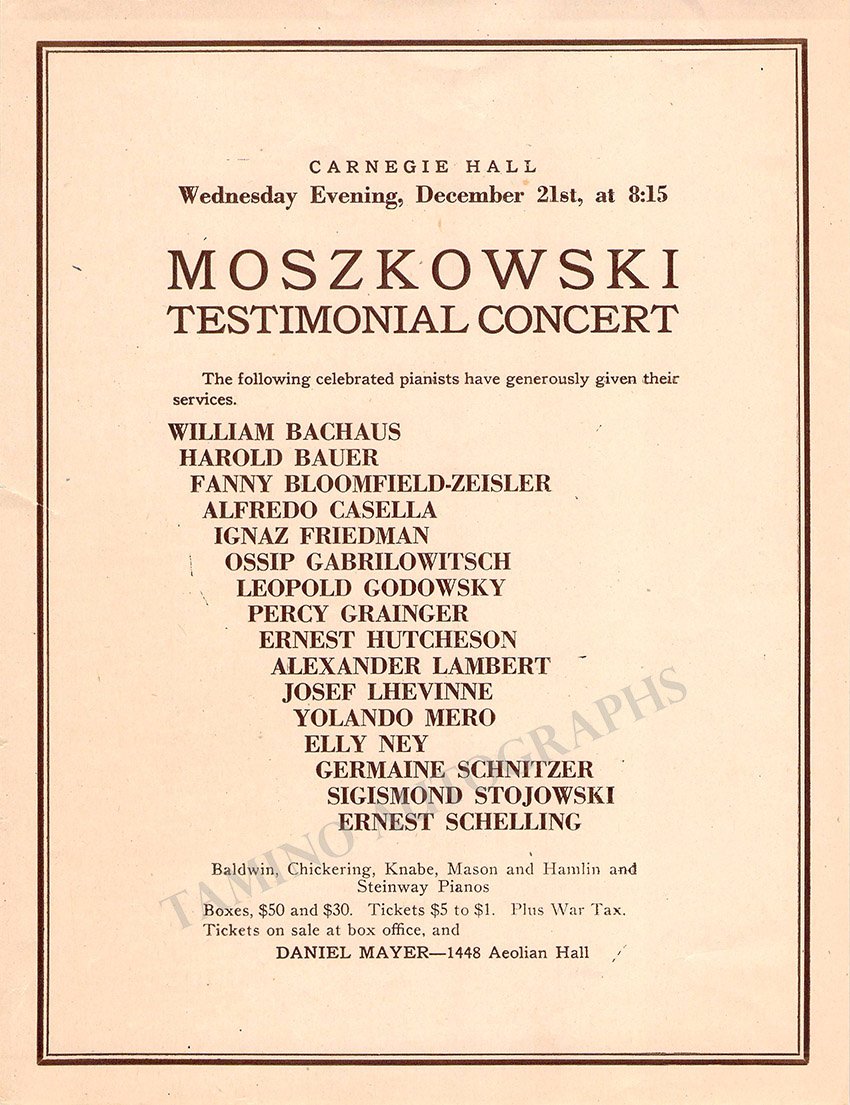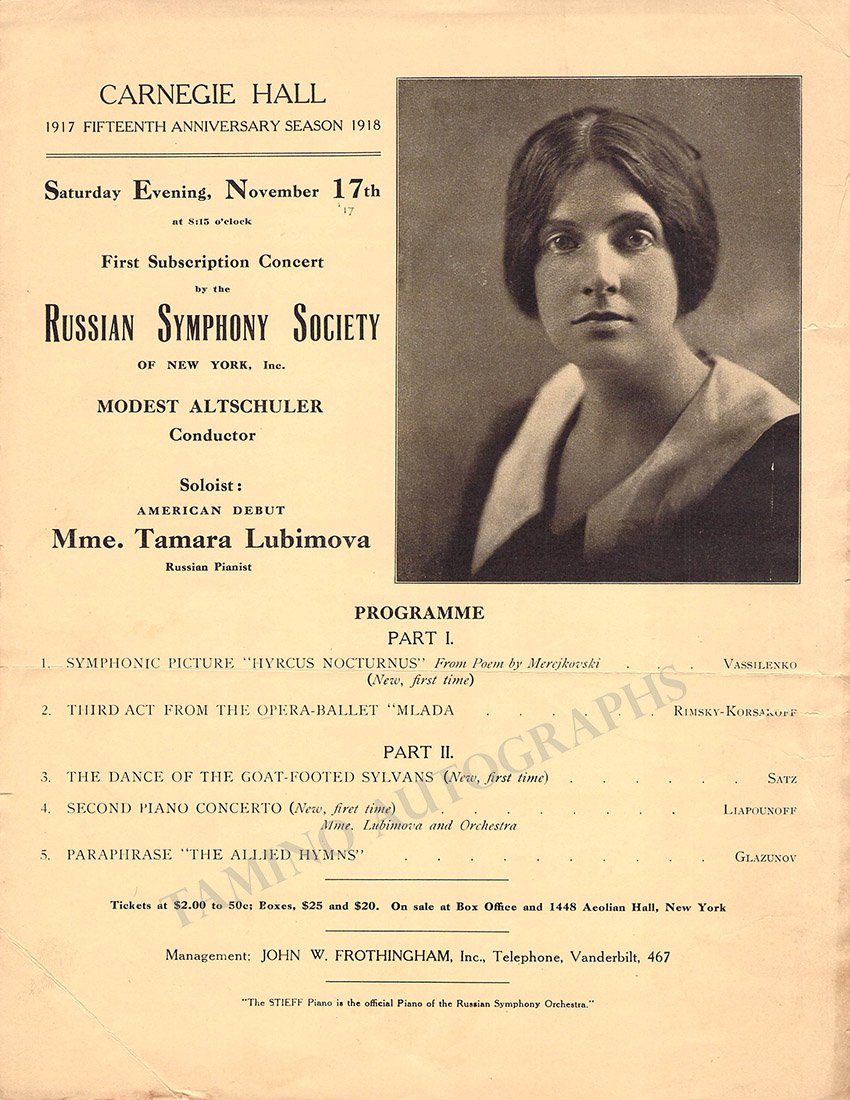 Group of 9 items, including 1 program and 8 playbill announcements for concerts in New York, at Aeolian Hall, Carnegie Hall and Town Hall. Artists include Olga Samaroff, Ignaz Friedman, Ernest Schelling, Freda Tolin, Ossip Gabrilowitsch, Harold Bauer, Tamara Lubimova.