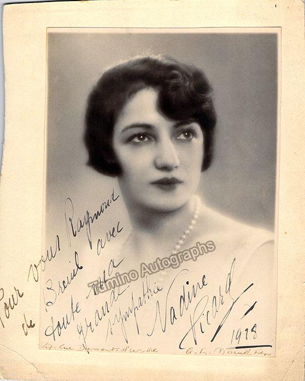 French actress (1896-?), signed photo, shown as herself. Inscribed and dated in 1928. Size is 8 x 10 inches, some wear on edges but in generally good condition.