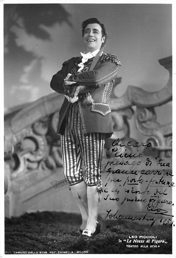 Italian baritone (1899-1962), signed photo, shown as Figaro in Mozart's Nozze di Figaro at La Scala, Milan, inscribed and dated in 1951. Blind stamped by photographer M.Camuzzi, Milan. Size is 4 x 5.75 inches, in excellent condition.