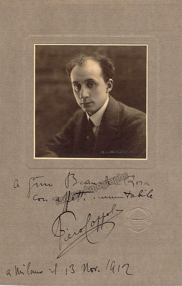 Black-and-white photograph mounted on a mat and signed by him with a short sentiment dated in Milan, 1912; blind-stamped on the front by photographer Carlo de Marchi. Total size is 7 x 10.9 inches, in very good condition.