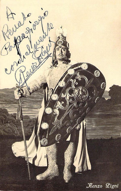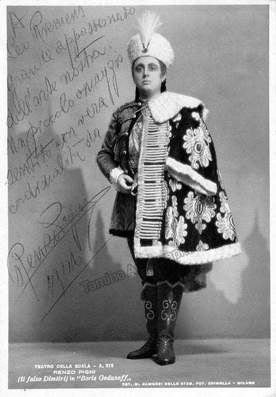Signed postcard photograph, shown as the False Dimitri in Mussorgsky's Boris Godunov, inscribed, and dated in 1946. Photograph by M. Camuzzi, La Scala, Milan. Size is 4 x 6 inches, in excellent condition.