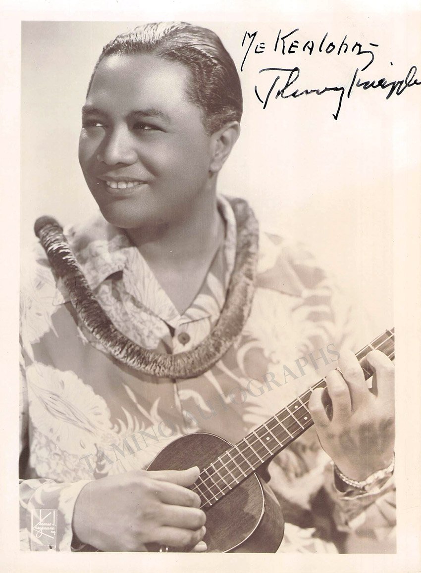 American Hawaiian-style guitarist and entertainer (1906-1981), born David Kaonohi, famous in the 1950s and 60s for his performances with Hawaiian traditional guitar and singing. Rare signed photo, shown with his guitar, with a short greeting in Hawaiian. Size is 5.25 x 7 inches, in excellent condition.