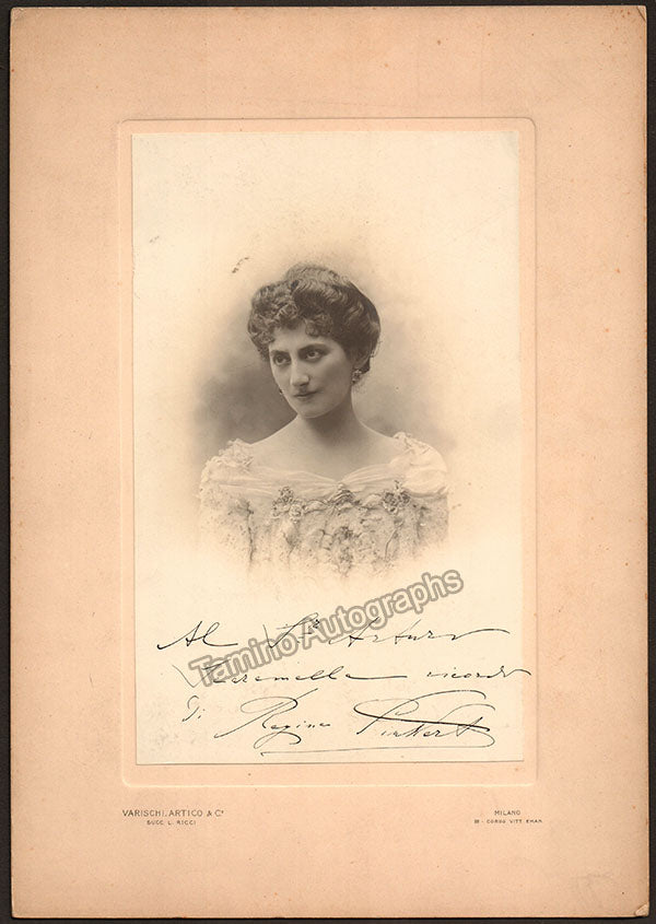 Signed photograph, shown as herself, inscribed. Beautiful vintage item with bold handwriting and signature. Photo by Varischi and Artico photographers, Milan. This is a 5.5 x 8.75 inch photo mounted onto larger cabinet backing, total item size is 9 x 13 inches, very slight creases on edges, otherwise in excellent condition.