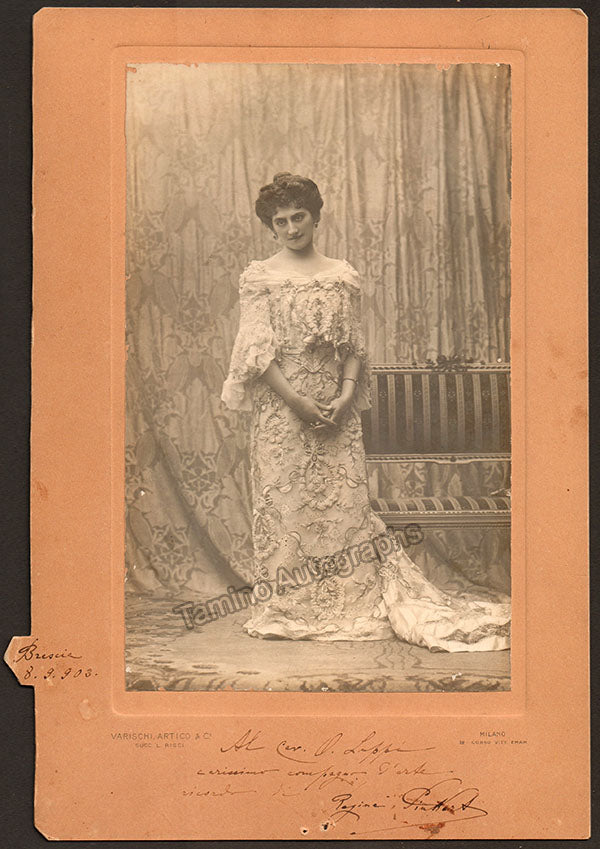 Signed photograph, shown most likely as herself, inscribed in Brescia, dated in 1903. This is a 5.5 x 8.75 inch photo mounted onto cardboard, handwriting and signature are not on the photograph itself but the surrounding cardboard area both to the left of and beneath the photo. Photo by Varischi and Artico photographers, Milan. Total item size is 8 x 11.75 inches, in very good condition.