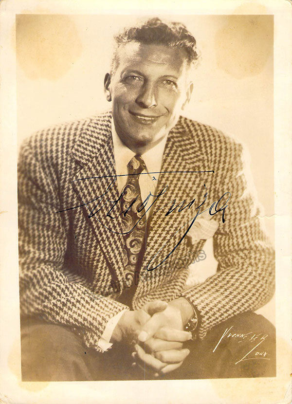 Signed photograph, shown in role (possibly Mephistopheles). Stamped on verso by photographer Sudak, Teatro Colon, Buenos Aires. Size is 7 x 9.5 inches, small creases and holes on far right of photo not affecting image and signature and some stains on verso, otherwise in good condition.