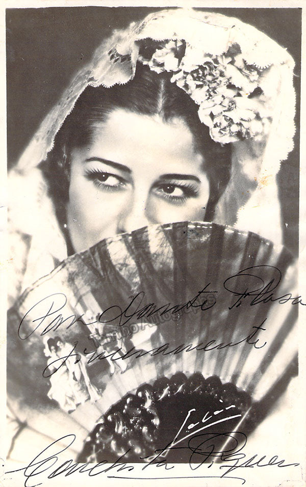 Spanish singer and actress (1908-1990), signed and inscribed photograph, shown most likely in role. Size is 3.5 x 5.75 inches, mounting traces on verso, otherwise in good condition.