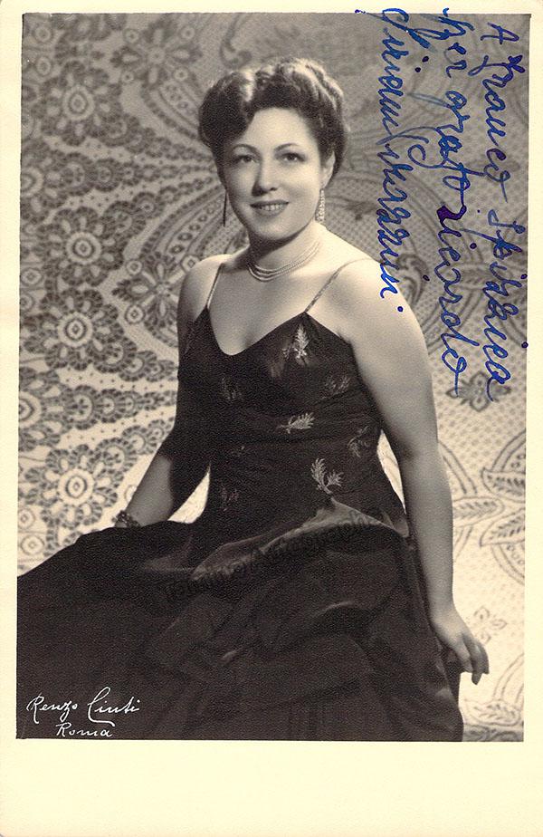 Italian mezzo-soprano (1918-2016), signed photo, shown as herself. Inscribed. Photo by Renzo Cinti, Rome. Size is 4.5 x 7 inches, in very good condition.