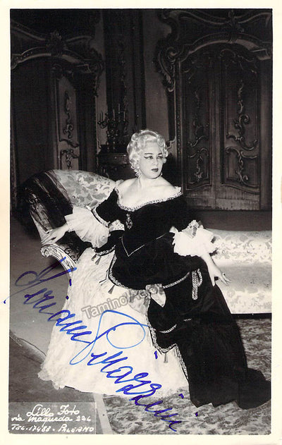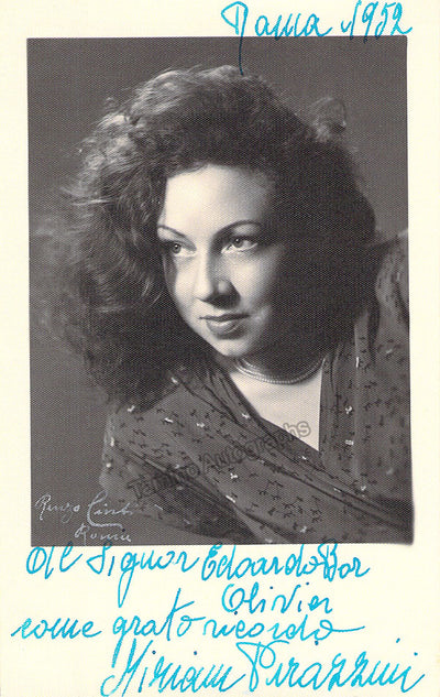 Signed postcard photograph, shown as herself. Inscribed and dated in 1952. Blind stamped by photographer Renzo Cinti, Rome. Size is 3.5 x 5.5 inches, in excellent condition.