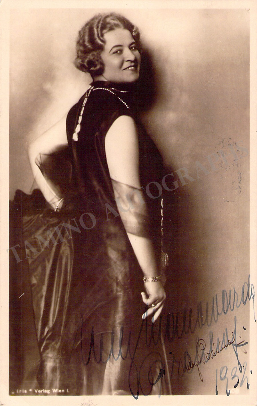 German soprano (c.1900-?), wife of famous Austrian bass Josef Von Manowarda, her full name was Cornelia Pirchoff- Manowarda. Signed postcard photograph shown as herself, signed as "Nelly Manowarda", dated in 1932. Size is 3.5 x 5.5 inches, in excellent condition.