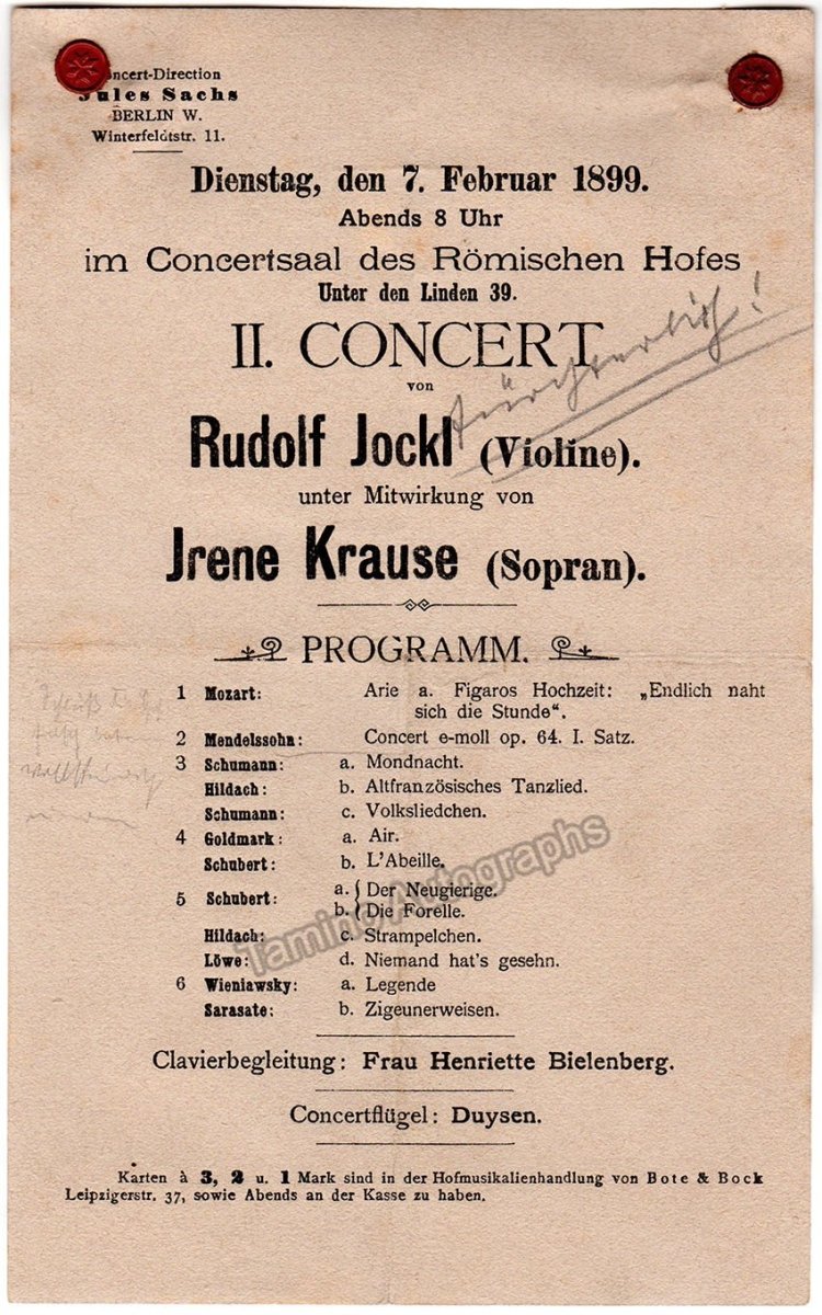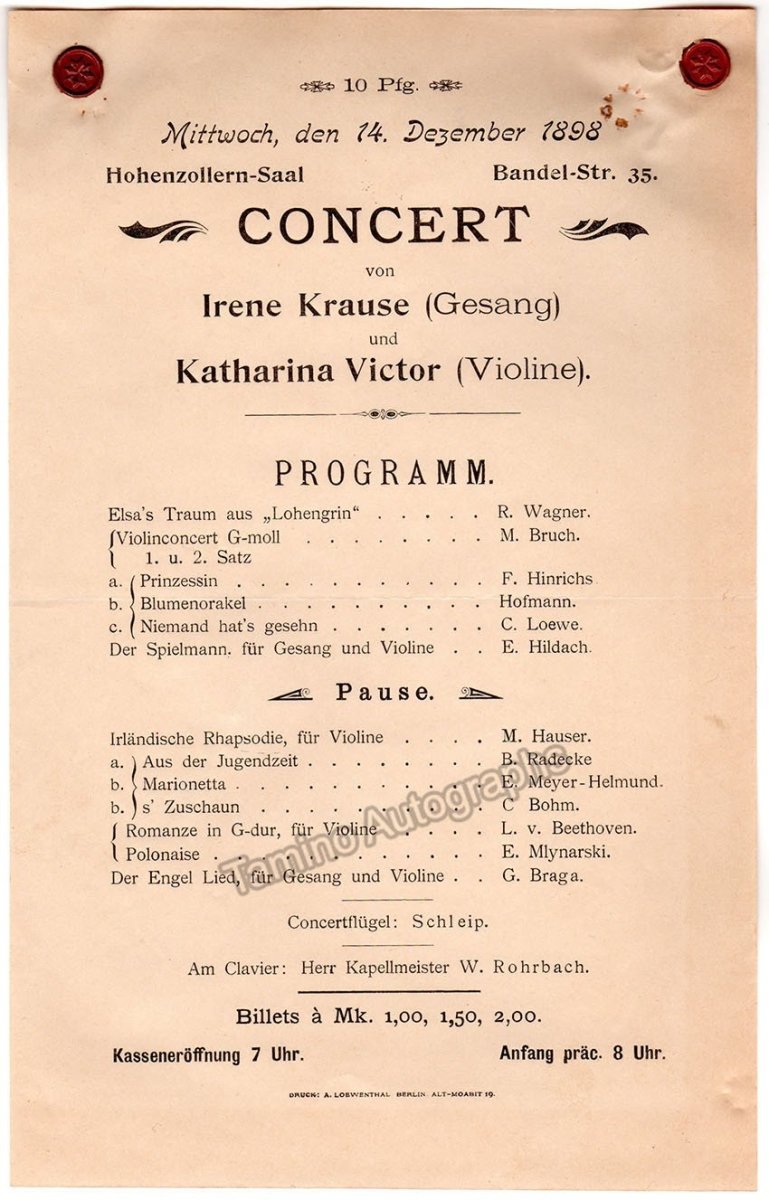 Franz Schörg, violin. Berlin Philharmonic Orchestra. Conductor: Josef Rebicek. Mendelssohn, Bach, Saint Saens, Josef Joachim. December 29th, 1898. Irene Krause, singer and Katharina Viktor, violin. December 14th, 1898. Rudolf Jockl ,violin and Irene Krause, singer. February 7th, 1899.