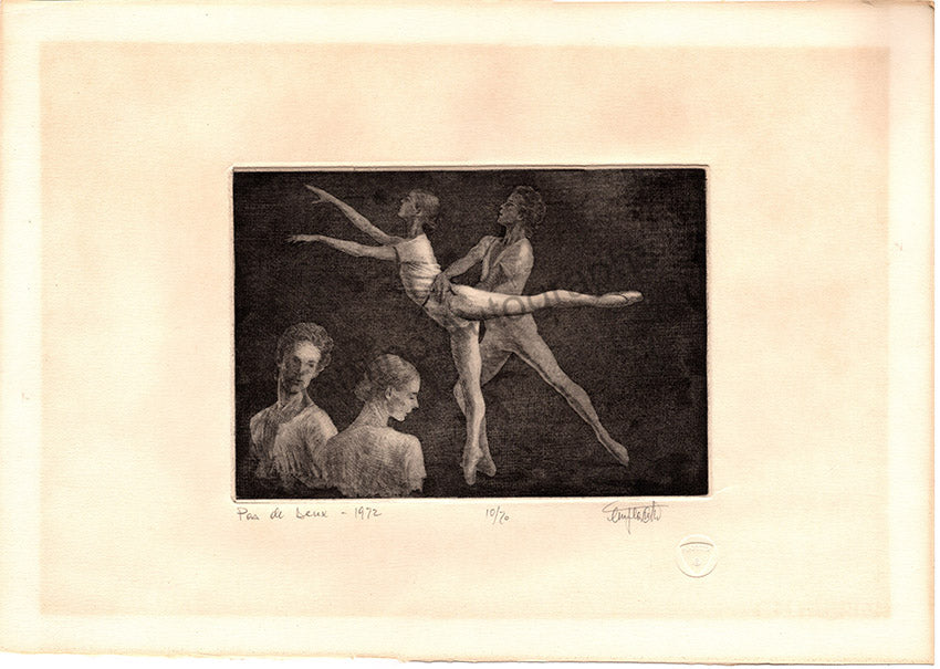 Original ballet etching by the Italian-born British sculptor (1921-1981) signed by him and entitled "Pax de Deux" (1972), numbered 10/20 in pencil, with the blind stamp of the sculptor on the front.  Total size is 19.5 x 13.5 inches, mat burn marks all-around borders, otherwise in excellent condition.