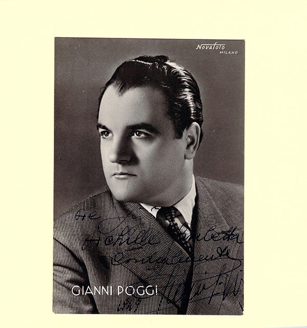 Fine black-and-white photograph signed and inscribed by him with a short sentiment dated 1956, shown as Mario Cavaradossi in Puccini's opera Tosca at Teatro Colon, Buenos Aires; ink-stamped on verso by photographer Alfa (Buenos Aires). Size is 5 x 7 inches, in excellent condition.