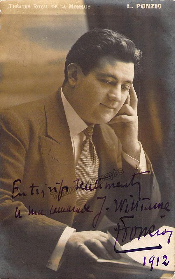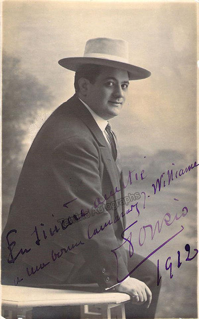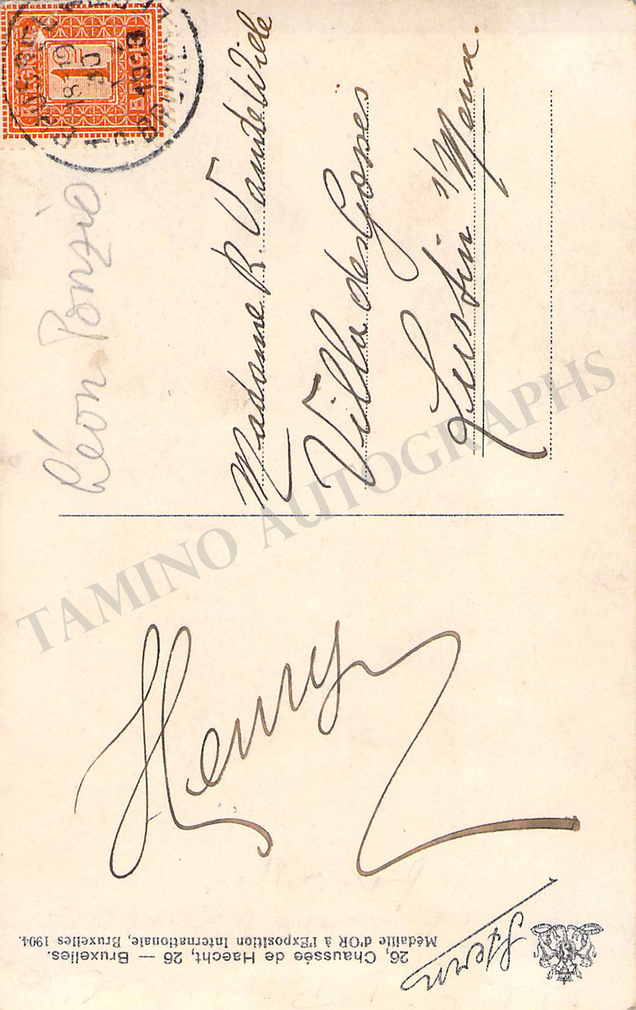 Signed postcard photograph, shown as himself, inscribed and dated in 1912. Bold handwriting and signature. Photo by Compagnie Belge, Brussels. Size is 3.5 x 5.5 inches, some silvering on corners, otherwise in excellent condition.