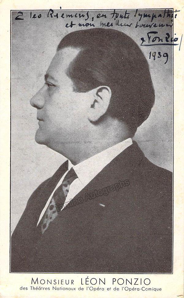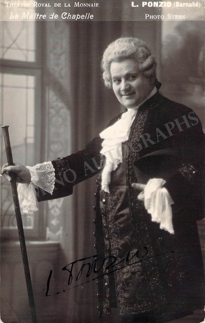 Signed postcard photograph, shown in role in Ferdinando Paer's opera Le Maitre de Chapelle, signed on front with additional handwriting on verso. Size is 3.25 x 5.5 inches, slight creases and paper loss on edges, otherwise in very good condition.