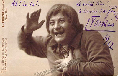 Signed postcard photograph, shown as Jaquinot in world premiere production of La Farce Du Cuvier, an opera by Gabriel Dupont. Inscribed with quote and dated in 1912. Photograph is by Stern of Brussels with signature on verso. Size is 5.25 x 3.4 inches in excellent condition