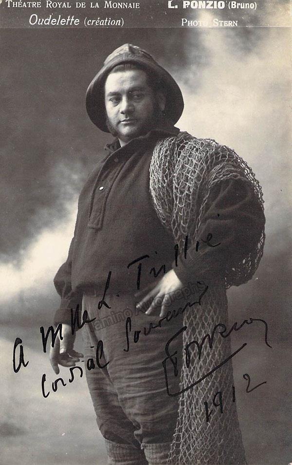 Signed postcard photograph, shown in world premiere production of Oudelette, an opera by Charles Radoux. Inscribed and dated in 1912. Photograph is by Stern of Brussels with printed signature on verso. Size is 3.5 x 5.5 inches in excellent condition.