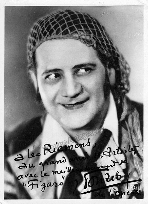 Signed photograph, shown in role (likely Figaro in Rossini's Barbiere di Siviglia), inscribed. Photograph by Piaz photo studio, Paris. Size is 5 x 7 inches, in very good condition.