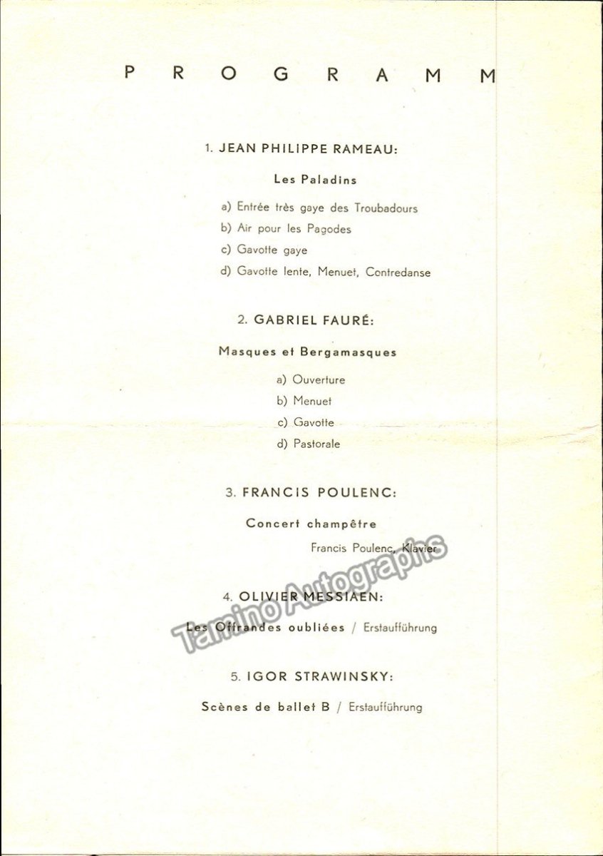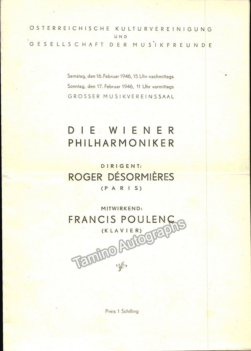 Concert program Vienna Musikverein, 16.-17. Feb 1946. Wiener Philharmoniker, Conductor: Roger Désormières Soloist: Francis Poulenc. Rameau: Les Paladine, Fauré: Masques et Bergamasques, Poulenc: Concert Champêtre, Messiaen: Les Offrandes oubliées (first performance), Stravinsky: Scenes de ballet B (first performance), 6 pages, 20,5 x 15 cm. excellent condition