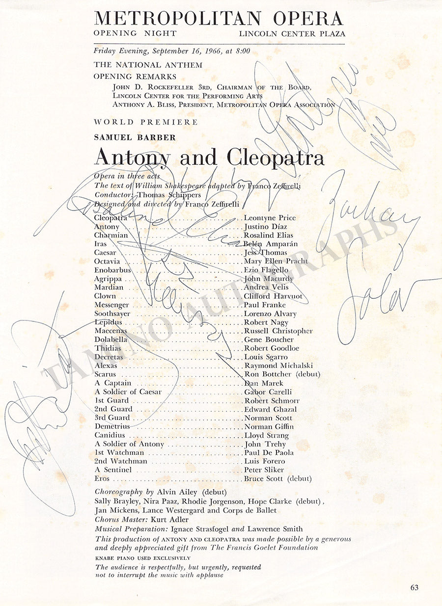 Cast page for the world premiere of Samuel Barber's "Antony and Cleopatra" for the new Metropolitan Opera opening in September 1966 signed by the star American soprano, the Puertorican bass-baritone, plus tenor Jess Thomas, mezzo-soprano Rosalind Elias, conductor Thomas Schippers, plus one unidentified signer.