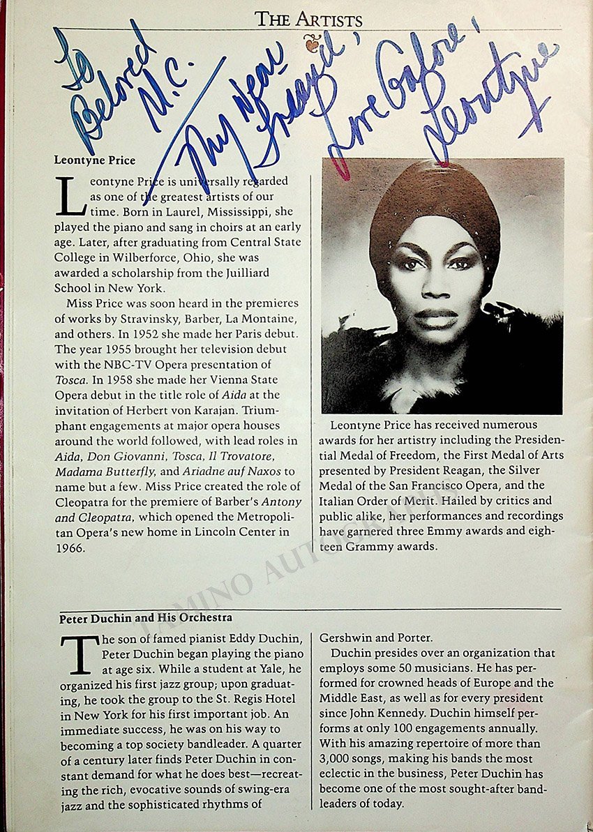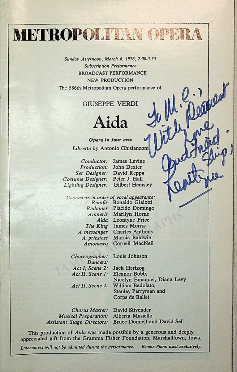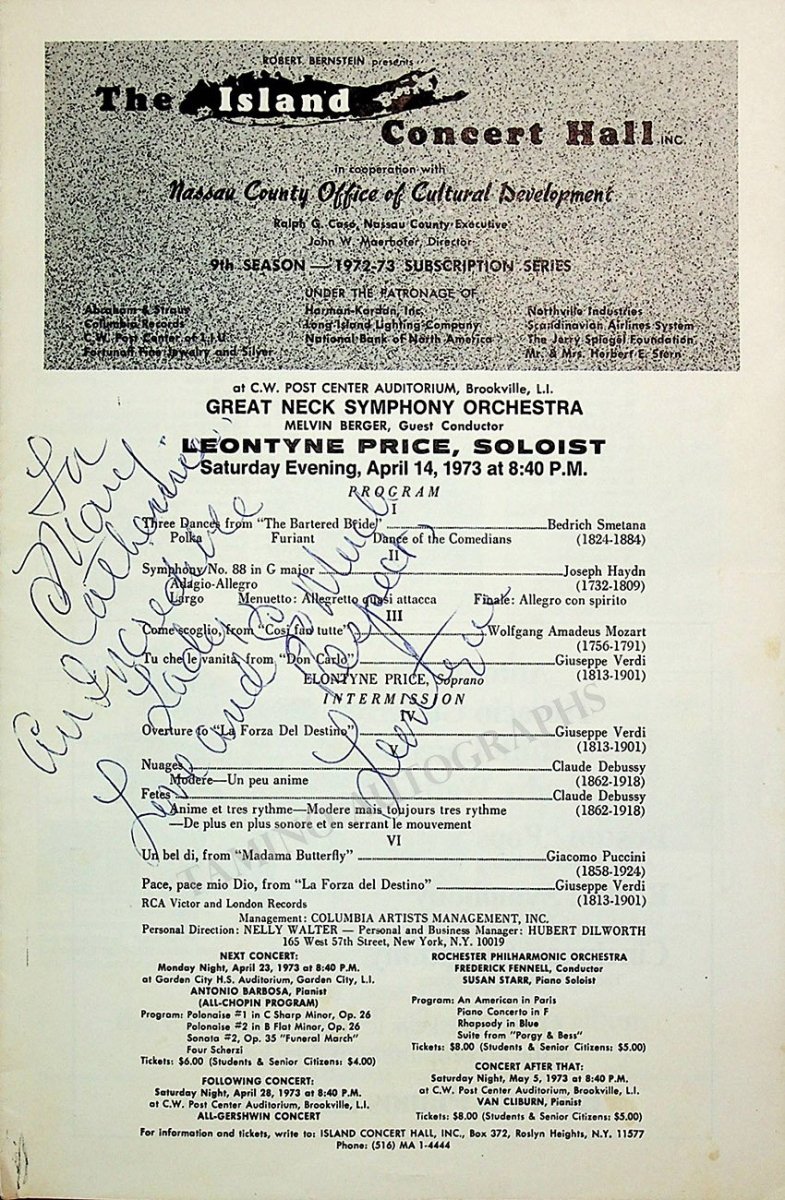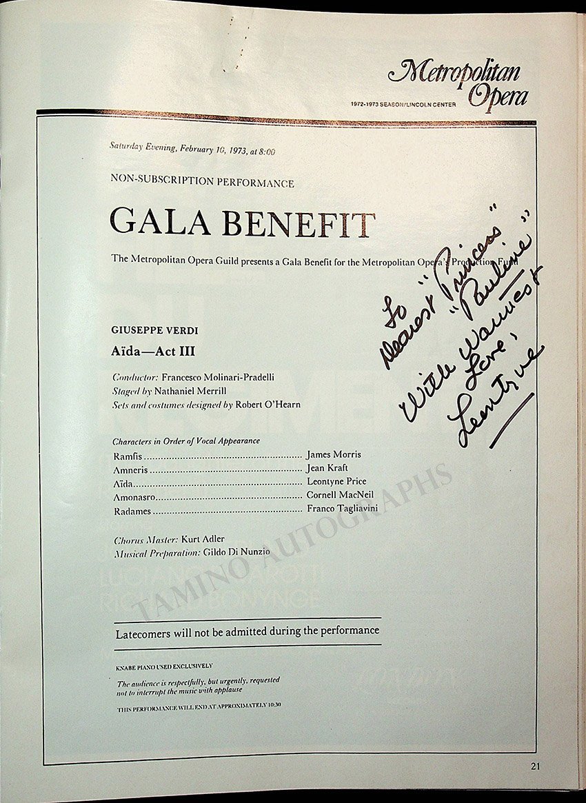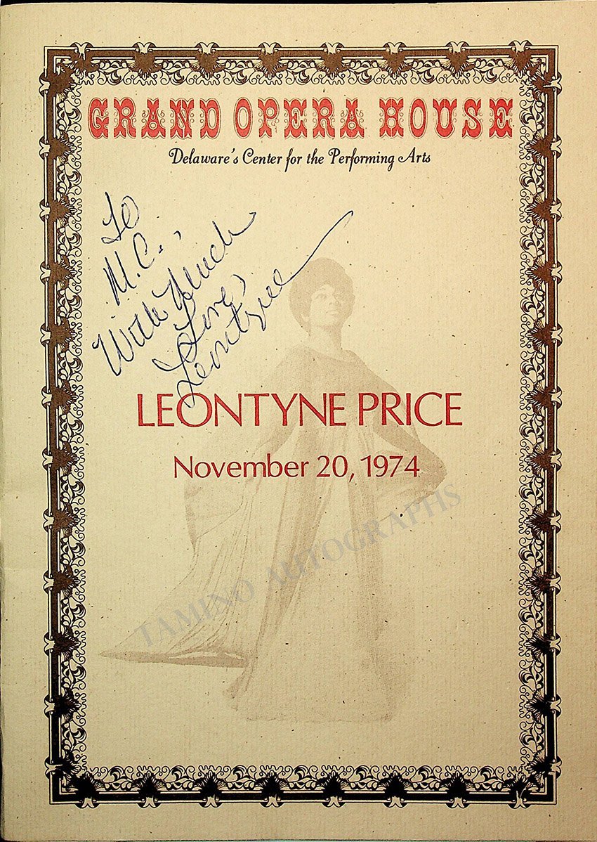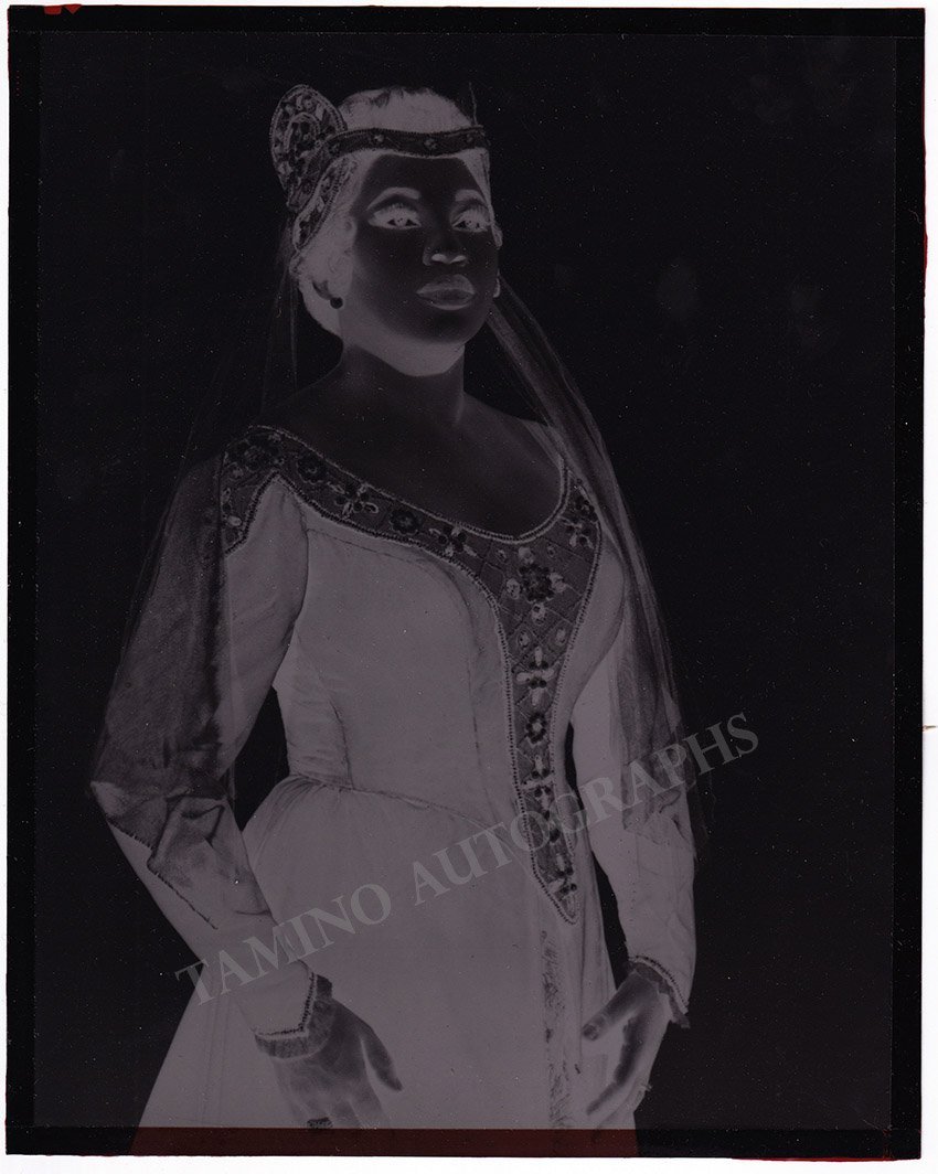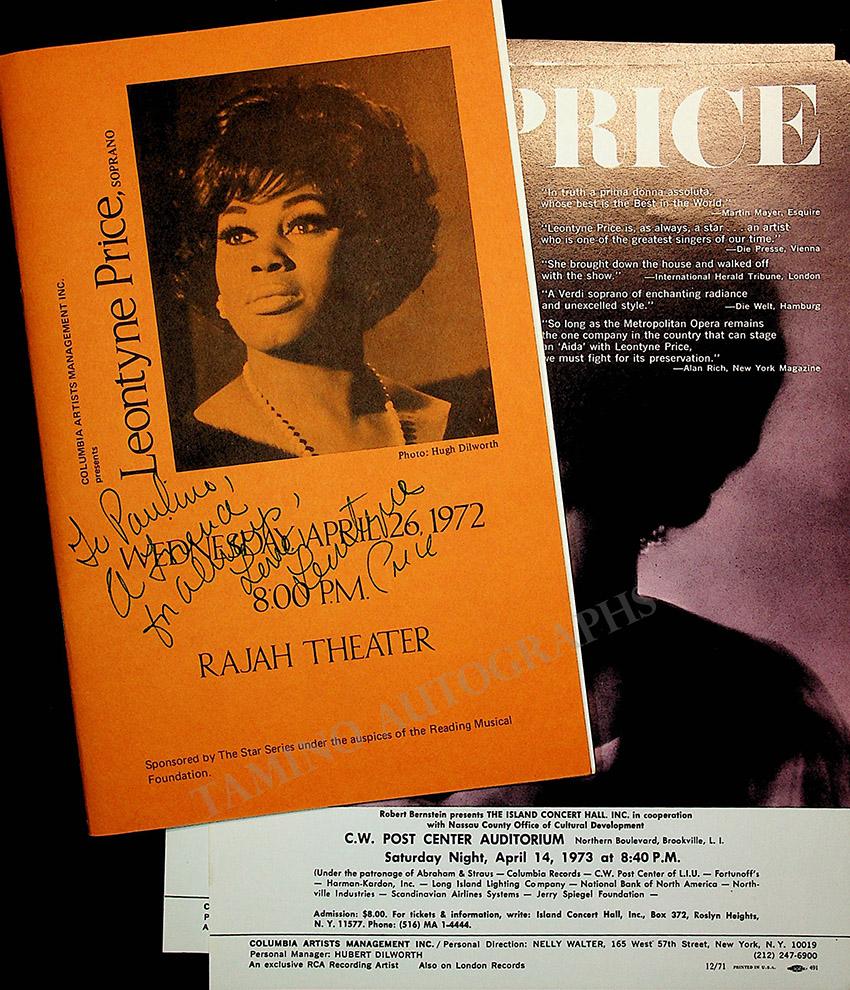 American soprano (b.1927), group of 33 items, most signed by her, including 23 signed programs from various performances of her, 9 sheets with copies from her schedule, distributed by her management, 8 autograph letters to a friend (not shown), 15 signed cards, many with envelopes, mostly Holiday Greetings and one for birthday, 7 mug shot photos, 3 unsigned programs/playbills (2 in duplicates) and 4 negatives (approx. 8 x 10 inches) of photos of her in role (Elvira in Puritani, Donna Anna in Don Giovanni, Cleopatra, Aida).