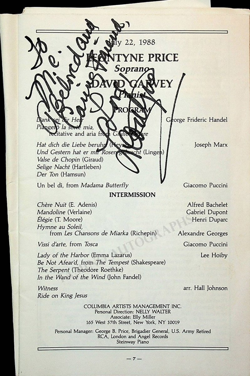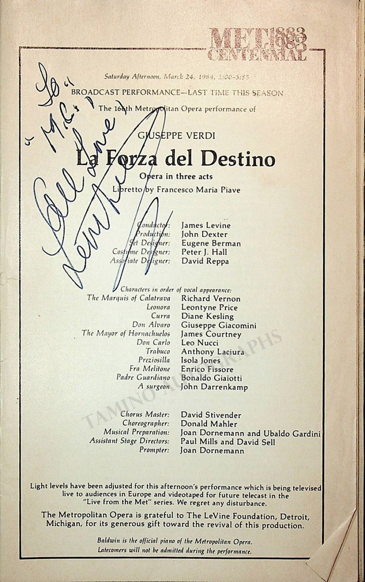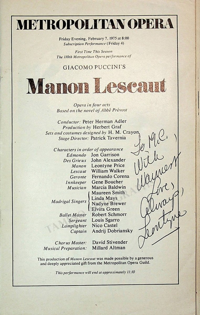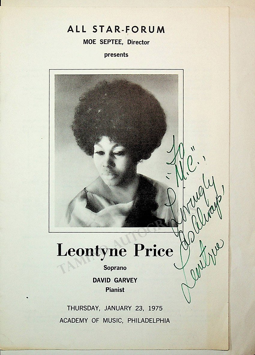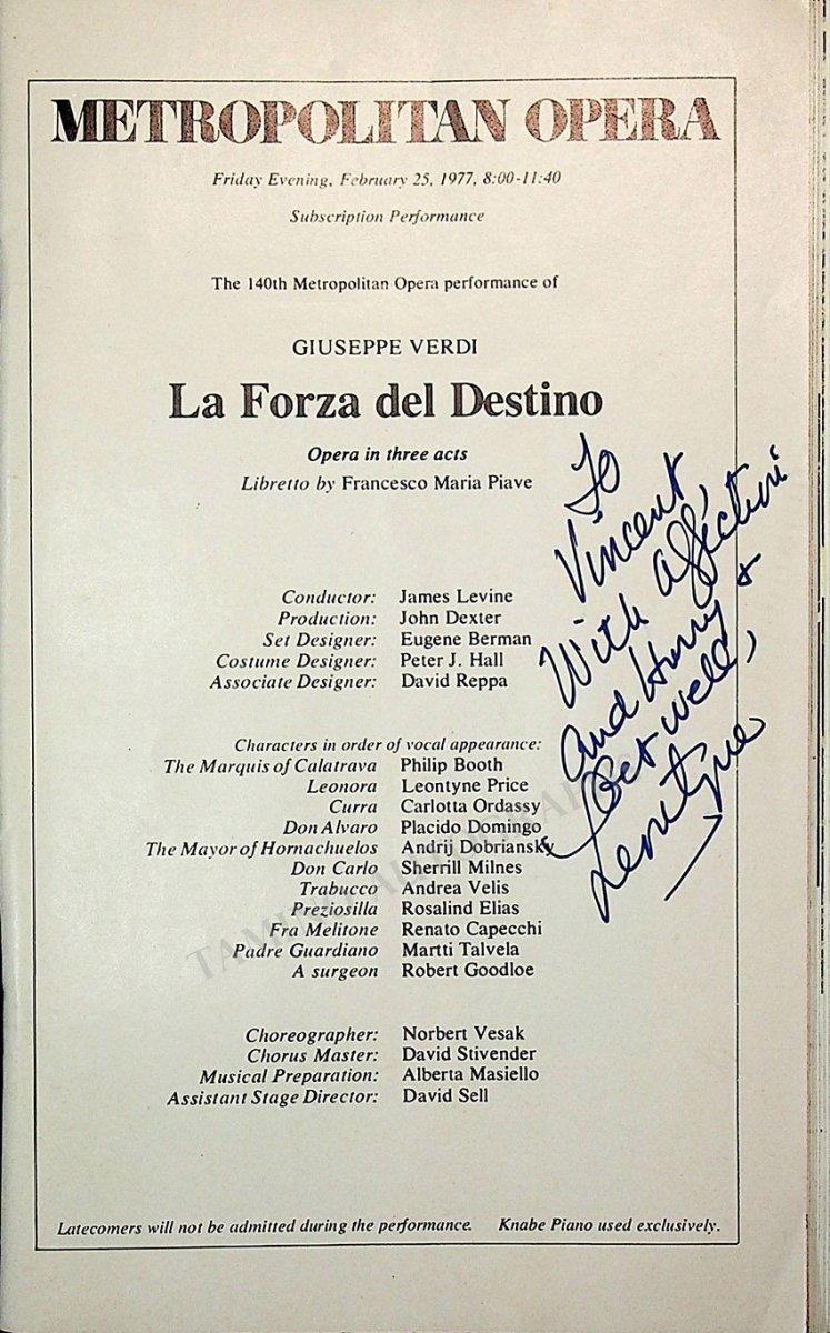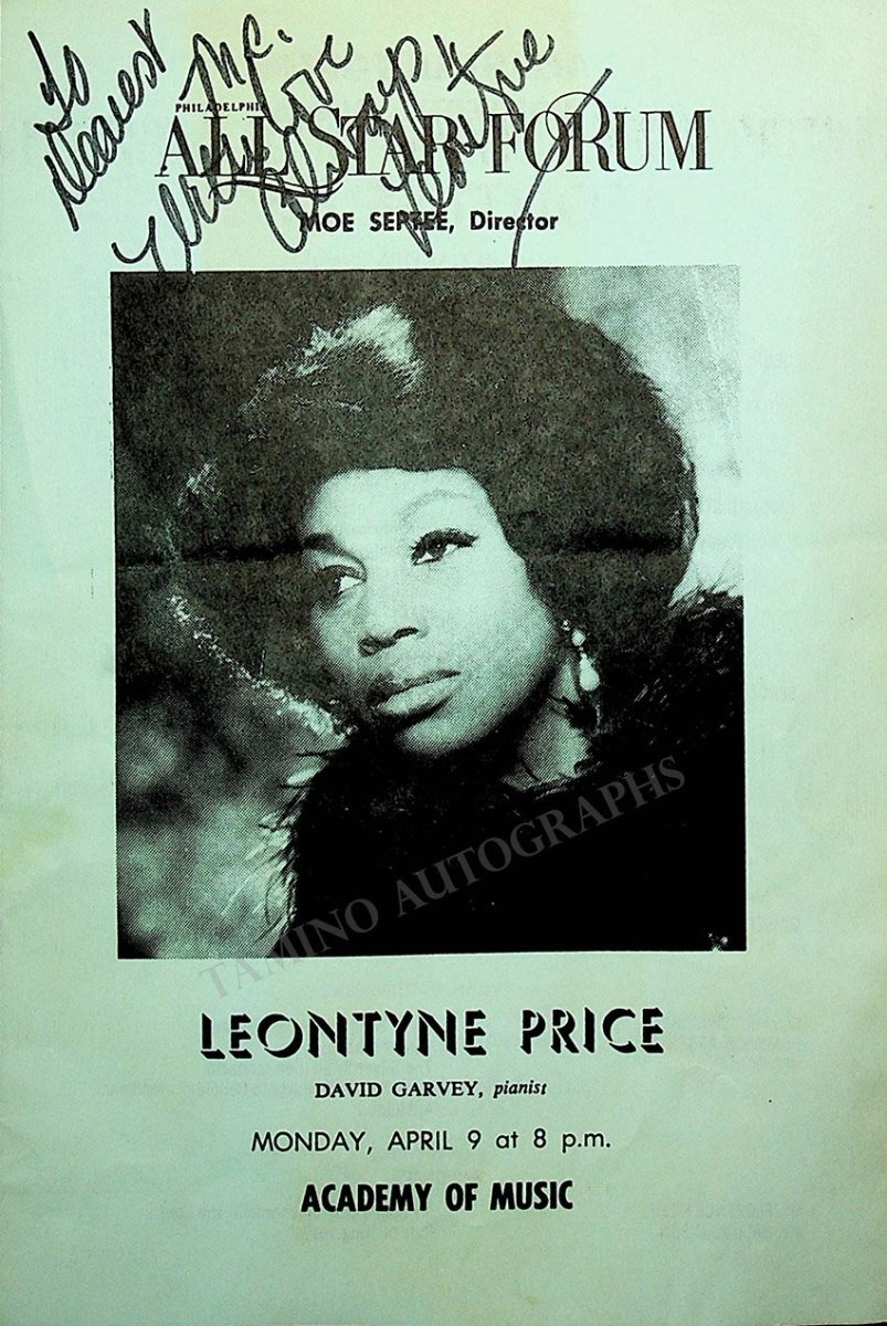 American soprano (b.1927), group of 33 items, most signed by her, including 23 signed programs from various performances of her, 9 sheets with copies from her schedule, distributed by her management, 8 autograph letters to a friend (not shown), 15 signed cards, many with envelopes, mostly Holiday Greetings and one for birthday, 7 mug shot photos, 3 unsigned programs/playbills (2 in duplicates) and 4 negatives (approx. 8 x 10 inches) of photos of her in role (Elvira in Puritani, Donna Anna in Don Giovanni, Cleopatra, Aida).