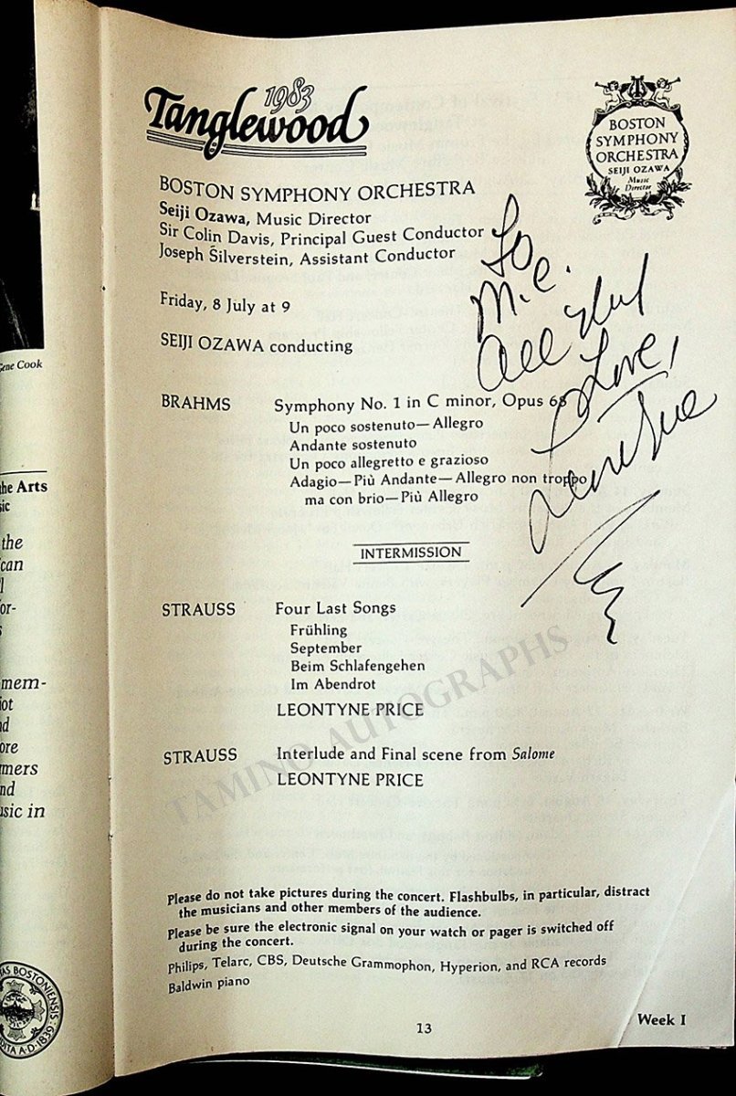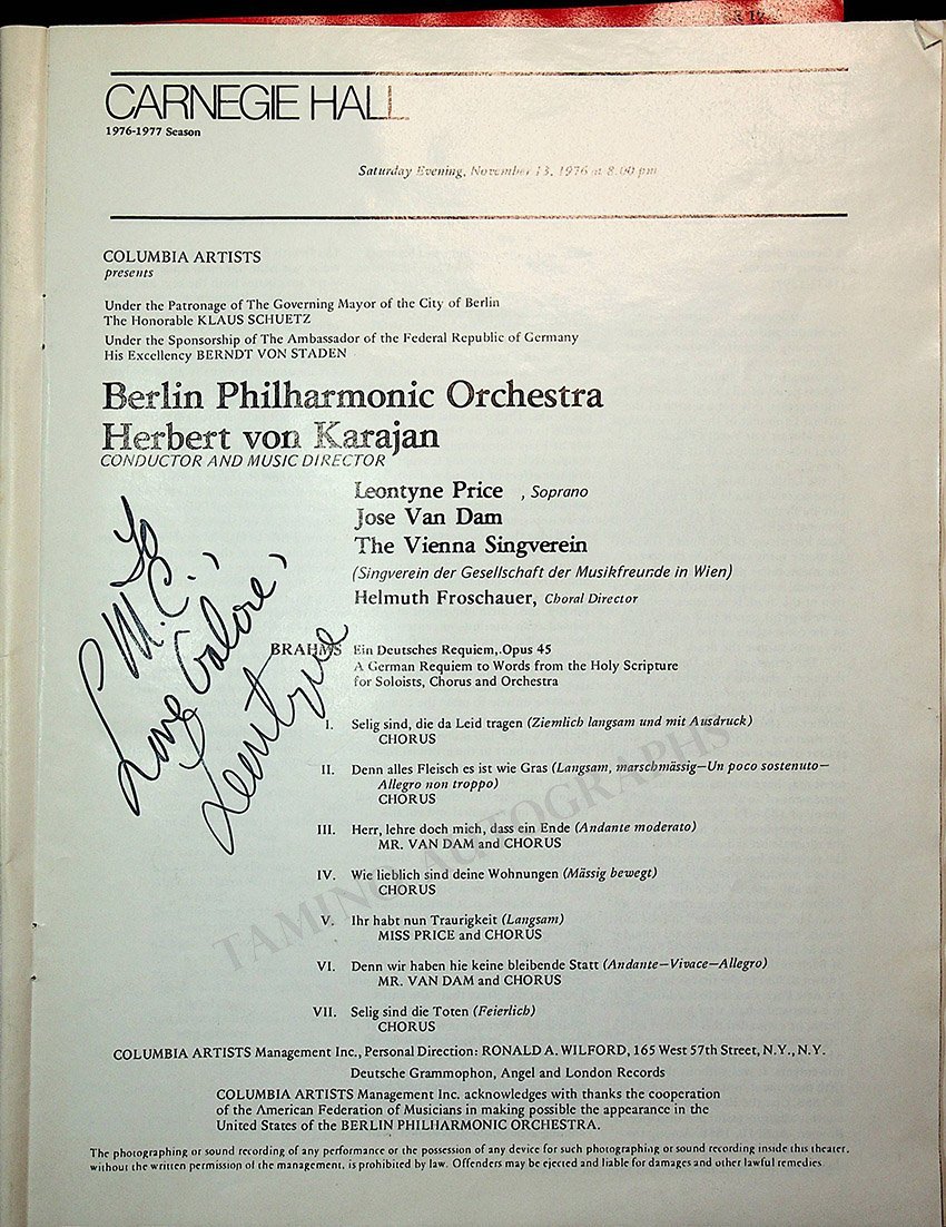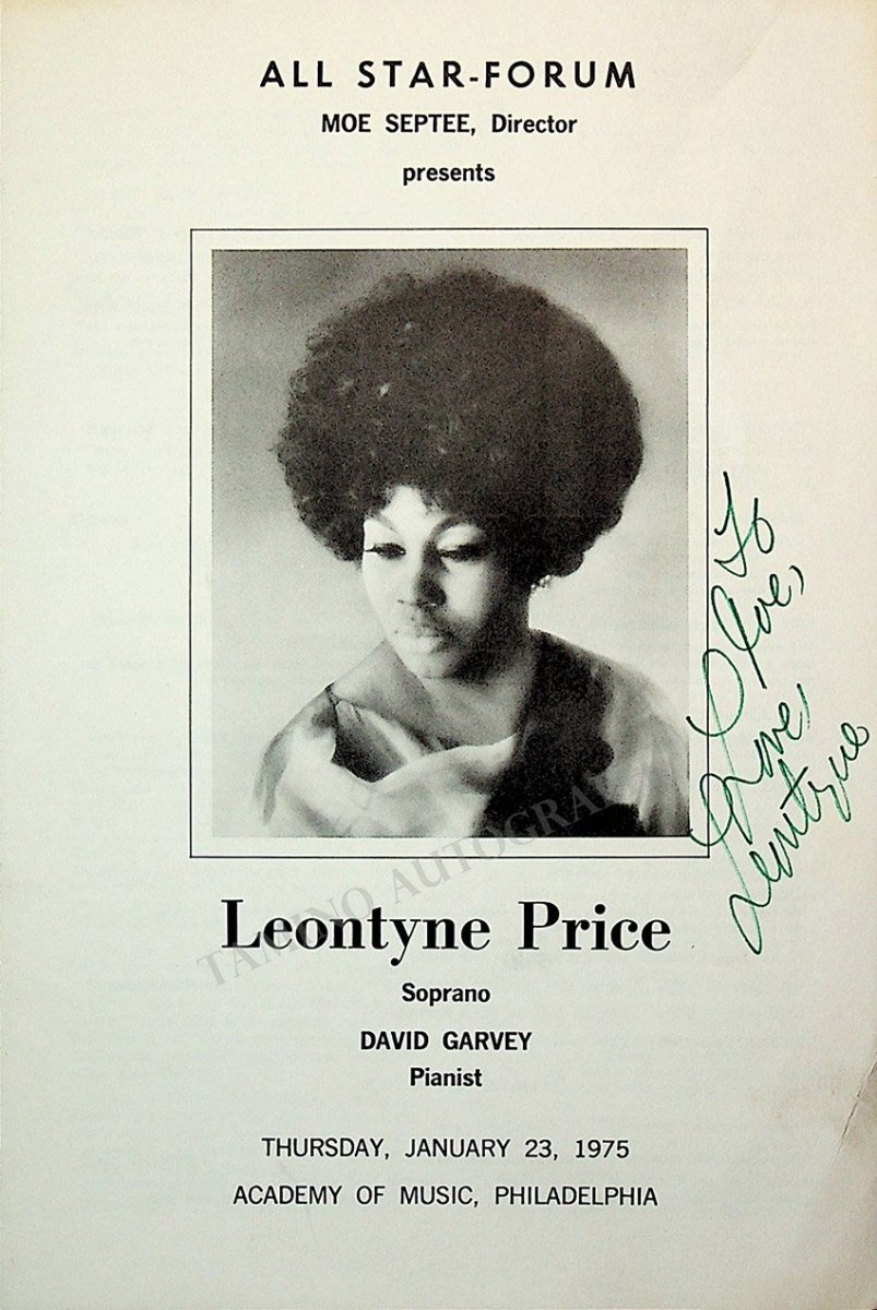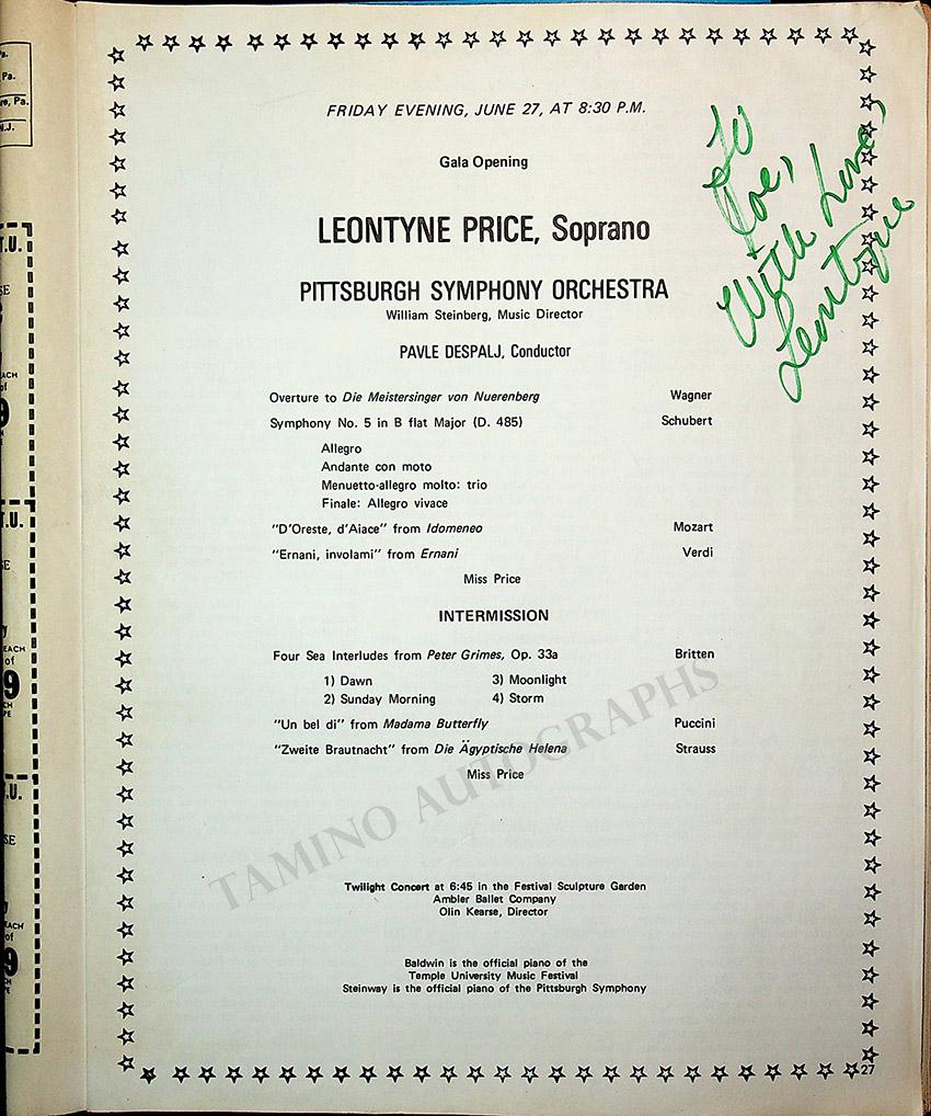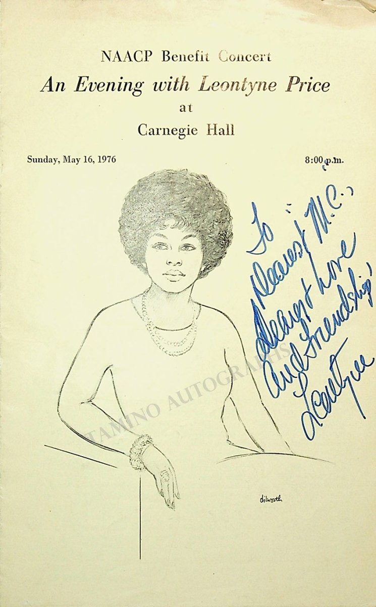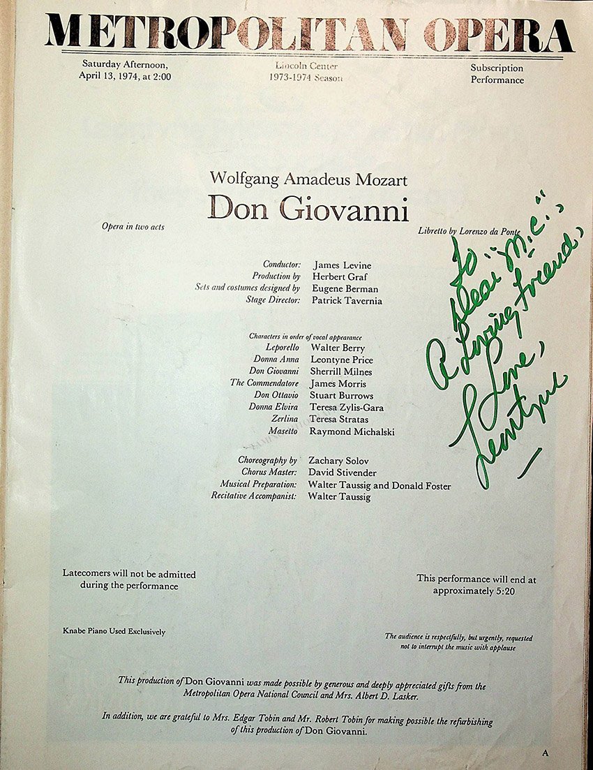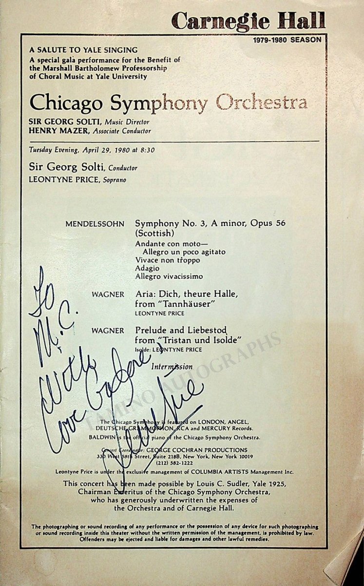 American soprano (b.1927), group of 33 items, most signed by her, including 23 signed programs from various performances of her, 9 sheets with copies from her schedule, distributed by her management, 8 autograph letters to a friend (not shown), 15 signed cards, many with envelopes, mostly Holiday Greetings and one for birthday, 7 mug shot photos, 3 unsigned programs/playbills (2 in duplicates) and 4 negatives (approx. 8 x 10 inches) of photos of her in role (Elvira in Puritani, Donna Anna in Don Giovanni, Cleopatra, Aida).