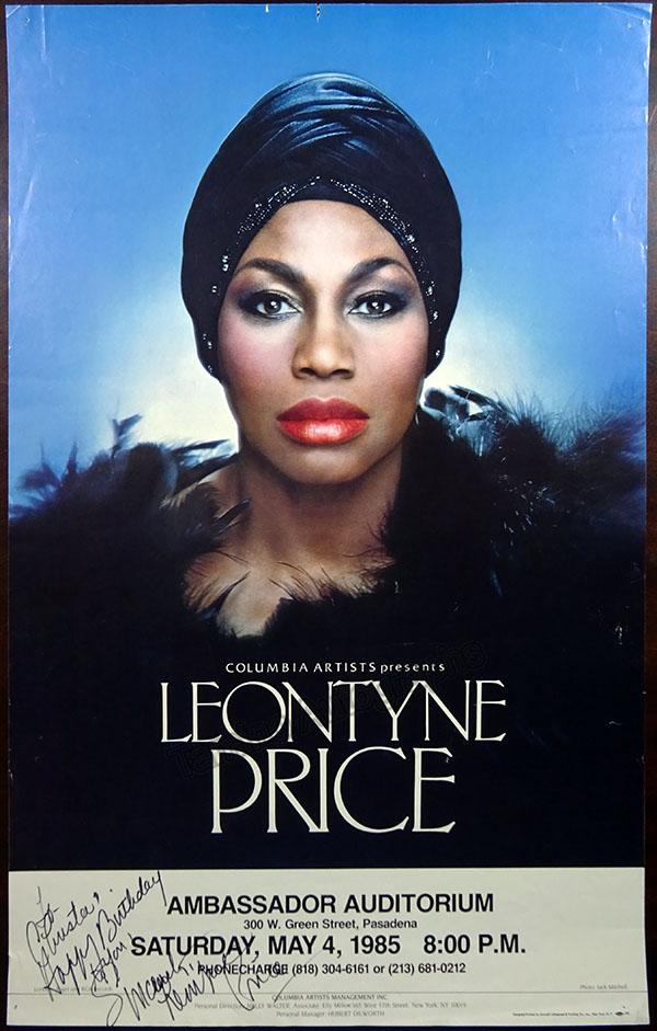 Legendary American soprano (b. 1927) especially celebrated for her Verdi and Puccini roles, signed poster, promoting a recital by her in Pasadena, California, May 4th, 1985, inscribed. Size is 14 x 22 inches, in very good condition.