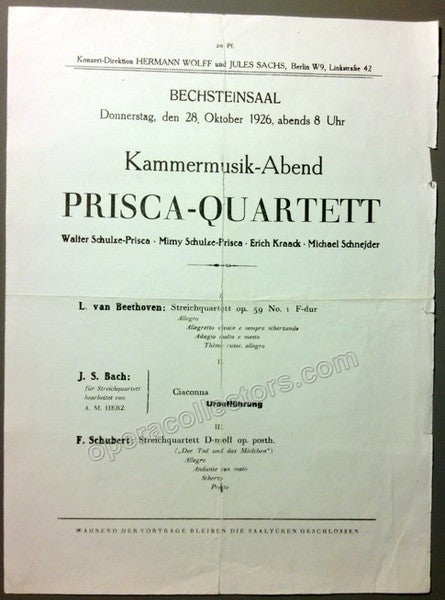 Prisca Quartet. Recital in Berlin, 28 October 1926. Beethoven, Bach-Herz (world premiere), Schubert. Rare! - In poor condition, no rust but has folds, and a big crack in the center. Priced accordingly. Size is 8.5 x 11.5 inches, 1 page