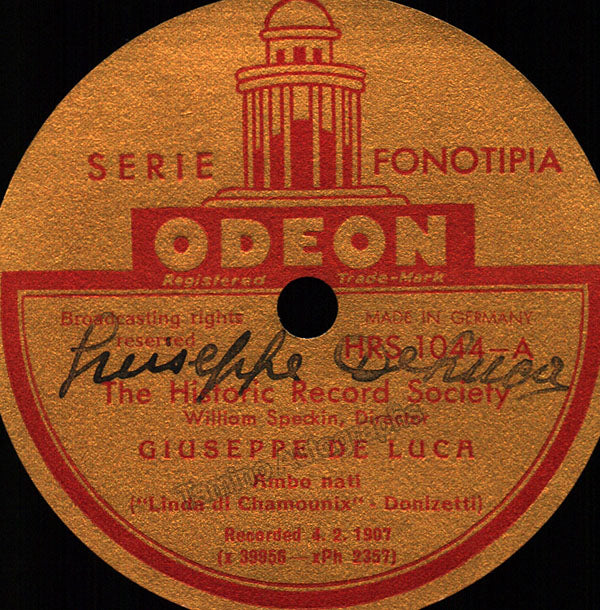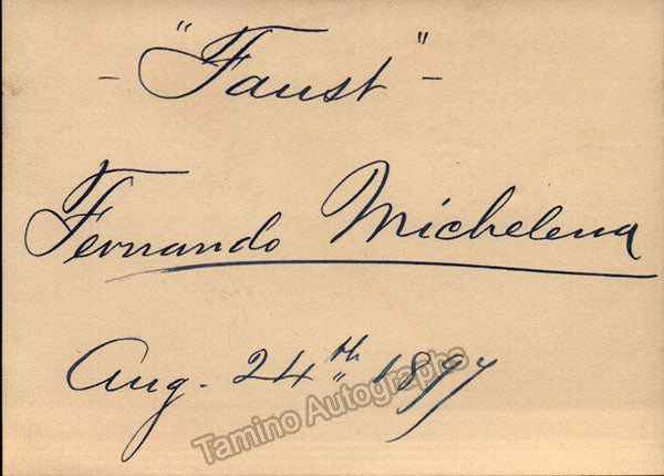 Collection of nine autographed items by prominent opera singers from the 1890s's to the 1930s including signed cards, signed album pages, signature cuts, and one signed record label. Includes such leading artists as Antonio Scotti, Giuseppe de Luca, Jean de Reszke, Lauritz Melchior, and Pol Plancon, among others. Sizes range from 2.25 x 2.5 inches to 7 x 7.5 inches. Most have very clear handwriting and signatures and all are in extremely good, well-preserved condition. See scans - not sold individually.