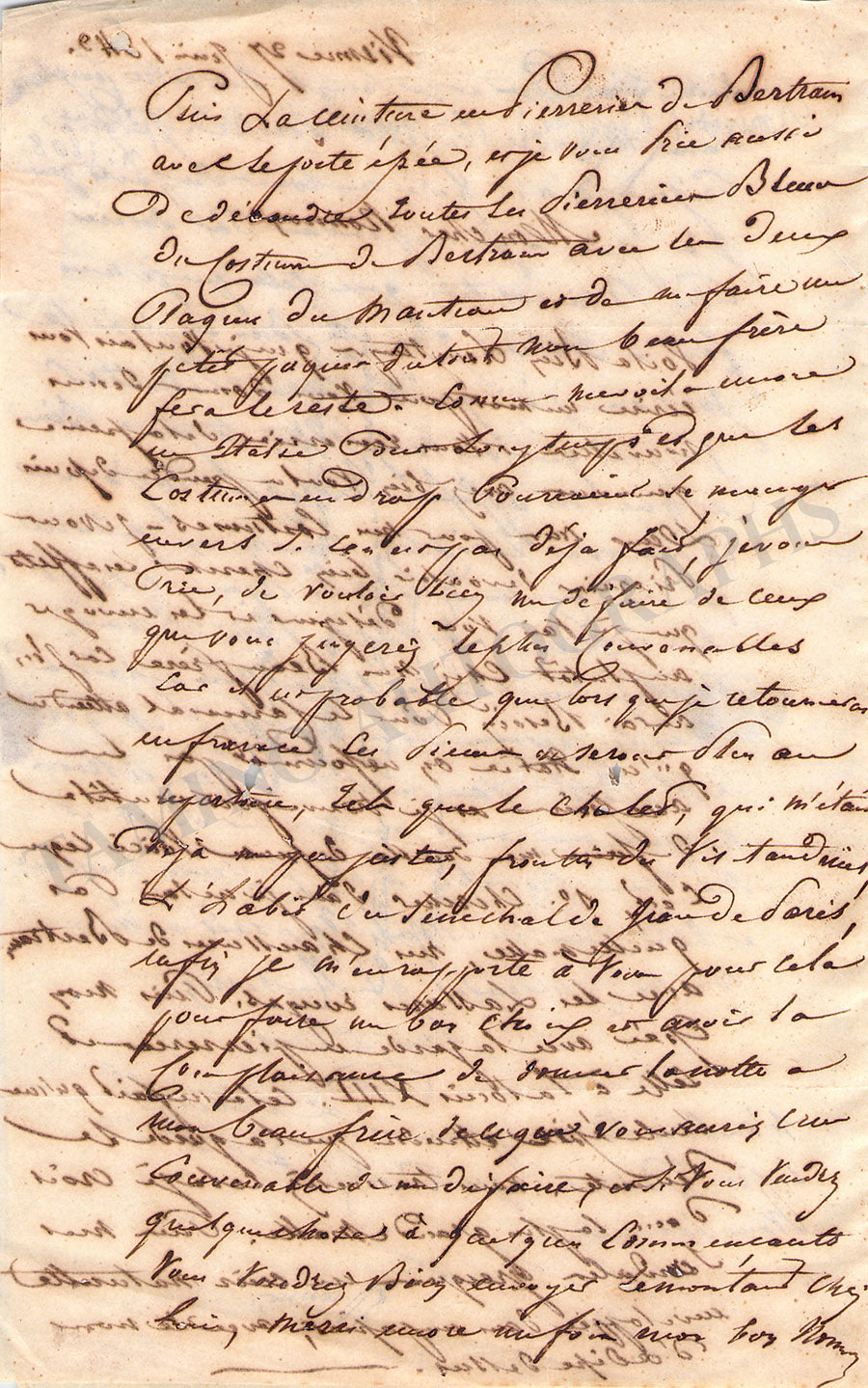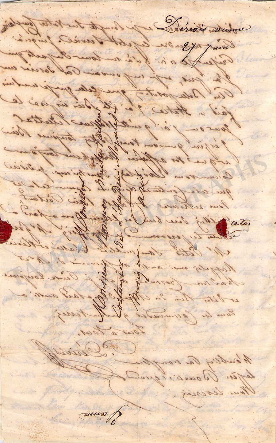 Autograph letter in French signed by him, dated June 27, 1849, addressed to Master Tailor and Costume Designer of the Royal Academy of Music in Paris, asking him to send him costumes for the Venice carnival of 1849. Size is 5.2 x 8.4 inches, 4 written pages, creases, some rust stain, in overall very good condition.