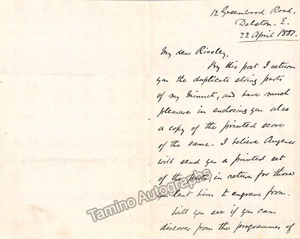 Autograph letter signed in 1887, 8 pages, in English, about music business. Each page is 4.3 x 6.9 inches, in excellent condition.