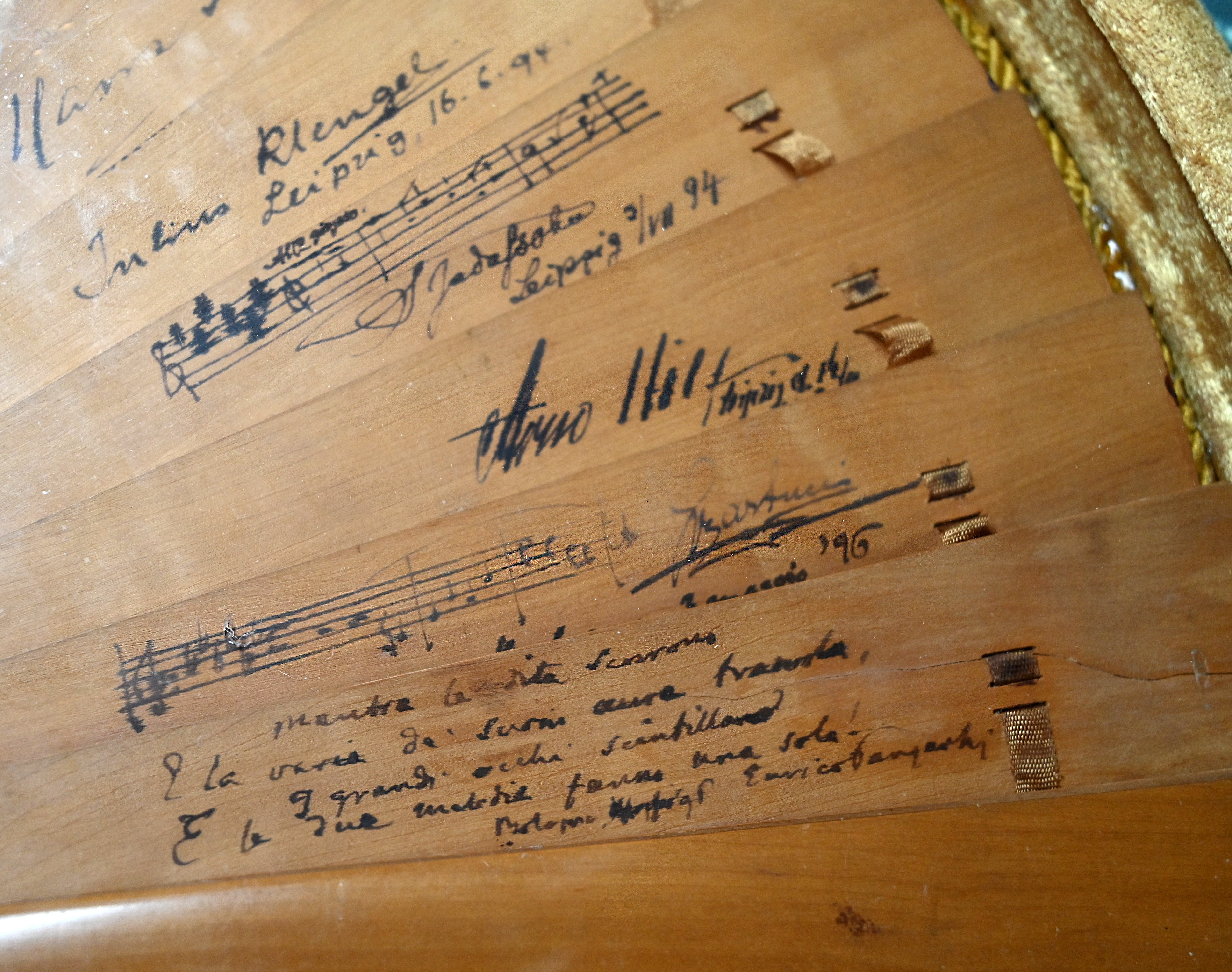 Signers include Enrico Caruso (who also created a small self-caricature), Giacomo Puccini, Edvard Grieg, Richard Strauss, Ildebrando Pizzetti, Joseph Joachim, Mattia Battistini, Alfred Grunfeld, Felix Weingartner, Ada Negri, Cesare Rossi, Salomon Jadassohn, Antonio Fogazzaro and others we could not identify. Some of the signatures have music quotes.