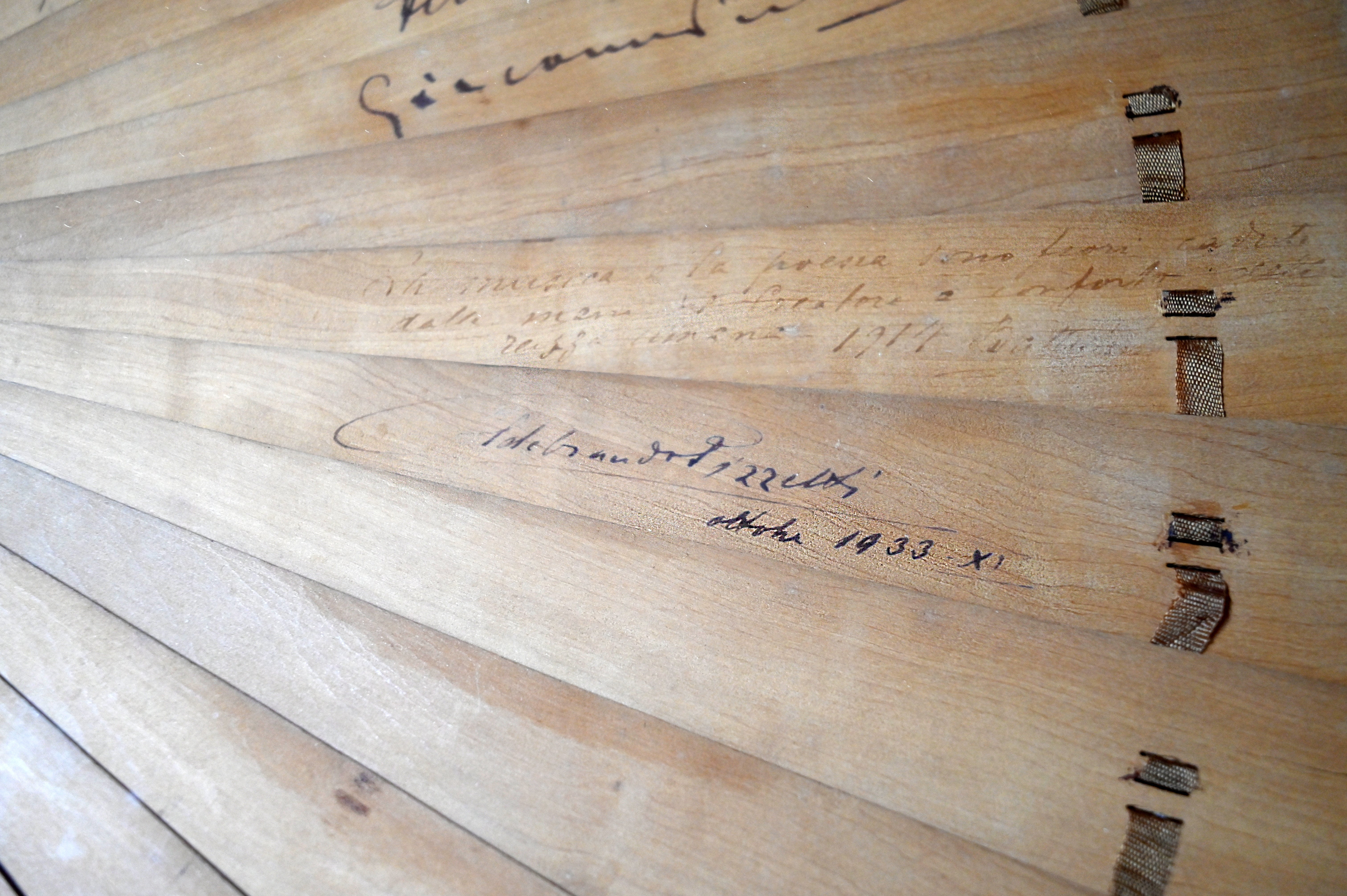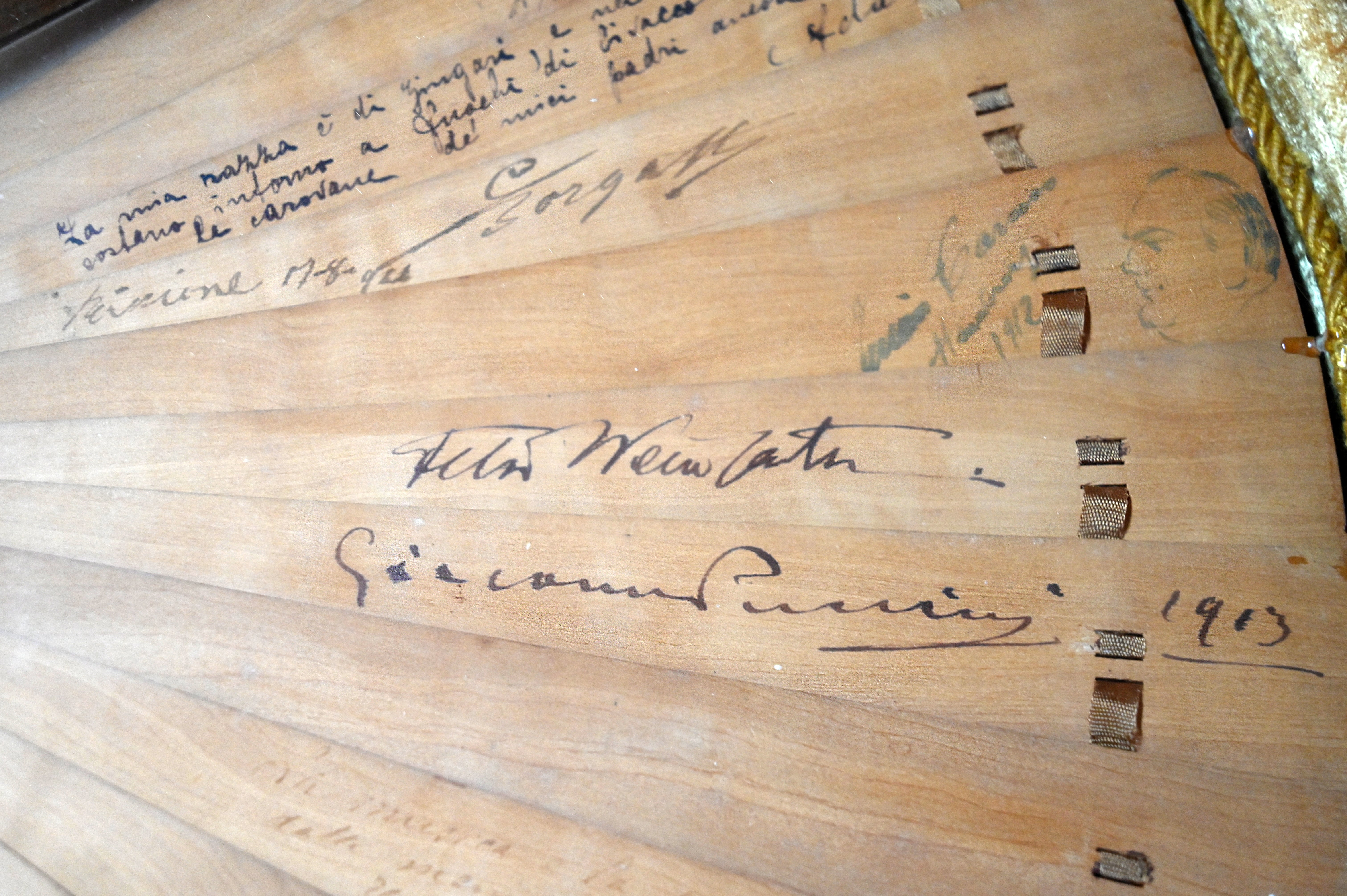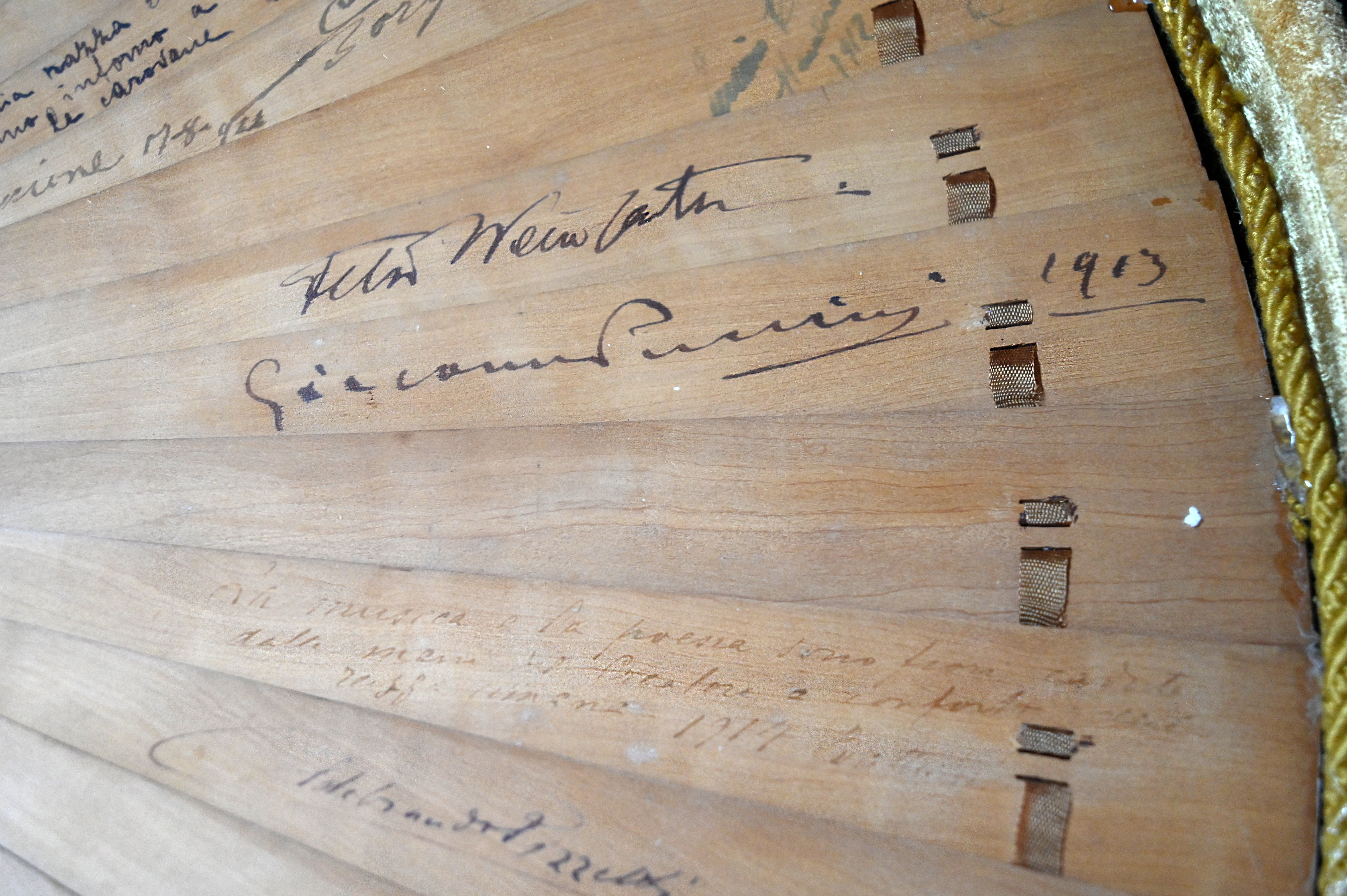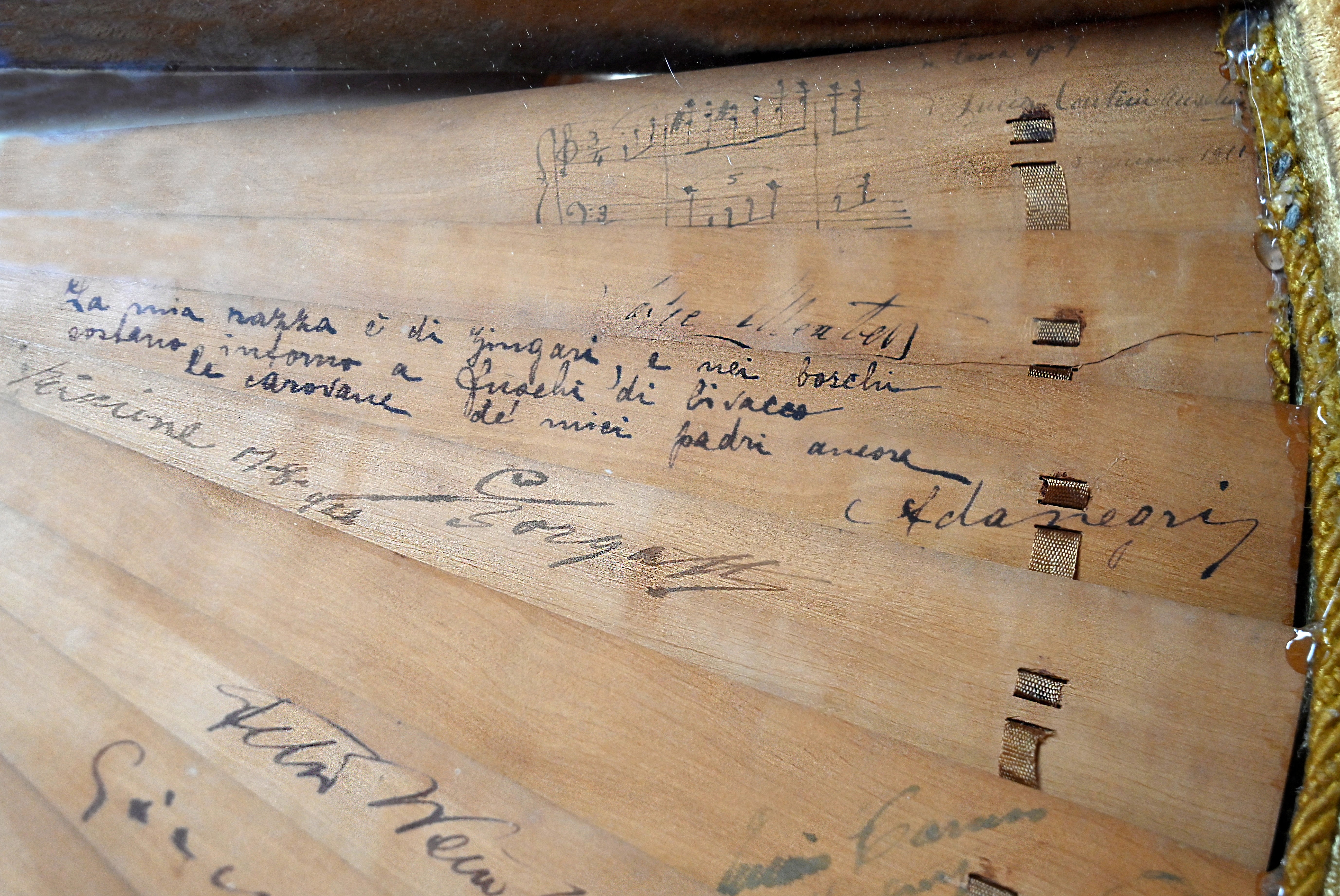 Superb piece of memorabilia consisting of a wooden fan, signed on both sides by many important music personalities. Fan belonged to Olga Jacchia, a singer from Italy, later socialite. Jacchia collected herself these signatures over a period of more than 40 years, between 1893 and 1937.