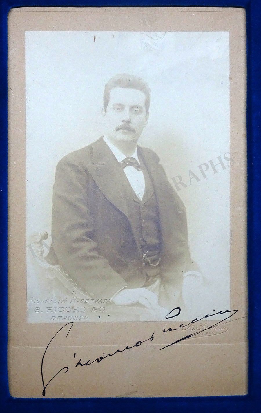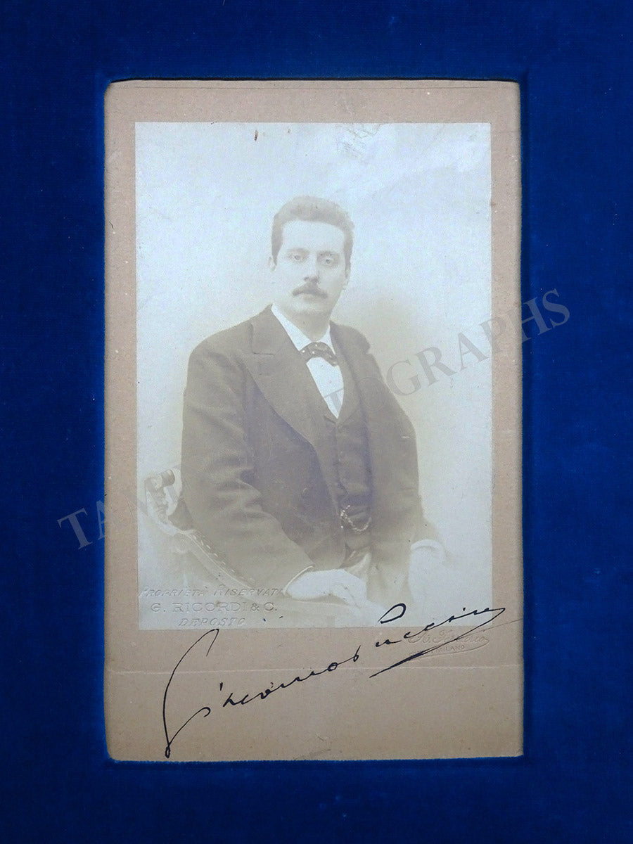 An original photograph by A. Ferraro, Milan, with the blind stamp of the photographer below the lower right corner of the image. Another blind stamp, over the lower left corner of the actual photo indicates this was provided by Puccini´s publisher G. Ricordi & Co.