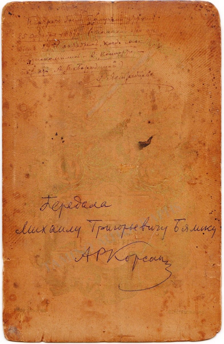 Below this, is a short text by the wife of Georgy M. Rimsky-Korsakov (1901-1965), grandson of the famous composer of the same last name, and a composer and teacher at the Leningrad Conservatory for over 30 years. He received this photo from Yastbretsov, and upon his death in 1965, his wife wrote this photo was handed over to a new owner named Mikhail Grigorievich Bialik. This is one of the very rare cases in which we can trace back in time not only the precise occasion of signing but perhaps the full line of ownership!.