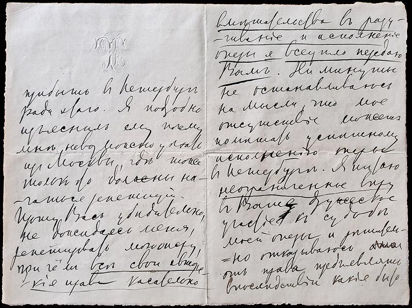 Four pages on paper with Tchaikovsky´s letter head (initialized PT), 11 x 8.7 inches (2 open pages), in excellent condition.