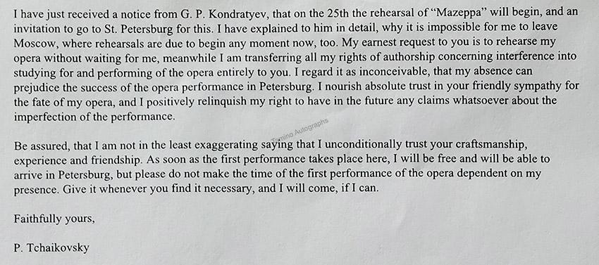 Provided with a full translation - A truly fantastic autograph letter of Tchaikovsky, with wonderful content. See scans.