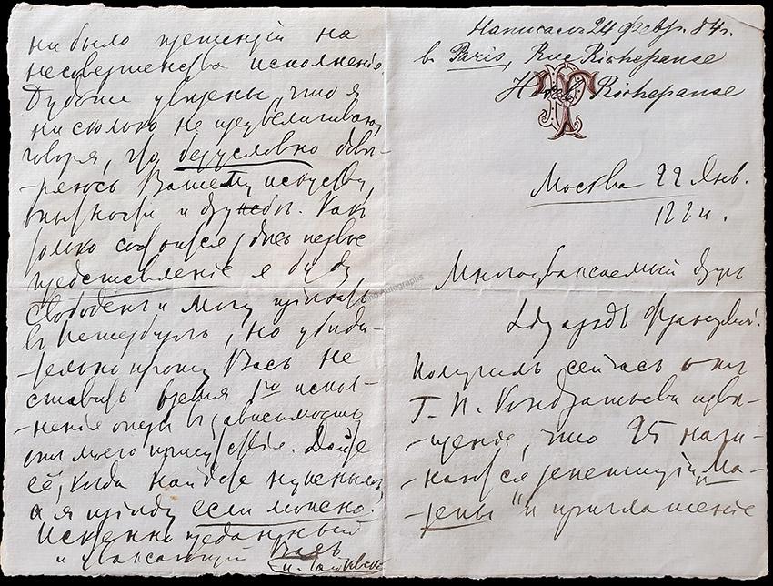 Remarkable autograph letter to his friend, famous conductor and fellow composer Eduard Napravnik (1839-1916) that he is unable to attend rehearsals of his opera Mazeppa in St. Petersburg, since he has to stay in Moscow for the rehearsals of the same opera in that city. Tchaikovsky composed "Mazeppa" between 1881 and 1883, with the final premiere in Moscow on Feb 3rd, 1884 and in St. Petersburg on Feb 6th, 1884 (all dates in the Old Style calendar) under Napravnik´s baton. This letter is from January 22nd, 1884, less than 2 weeks before the world premiere.