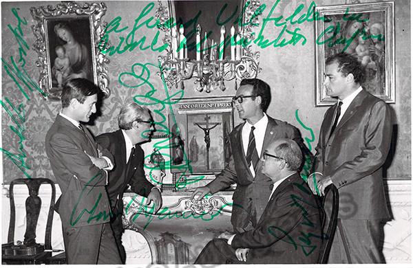Nice group photograph signed by all 5 members Sergio Lorenzi (piano), Riccardo Brengola (1st violin), Arnoldo Apostoli (2nd violin), Tito Riccardi (viola) and Alain Meunier (violoncello). Size is 7 x 4.5 inches, stamped on verso by photographer Studio Grassi, Siena. In excellent condition