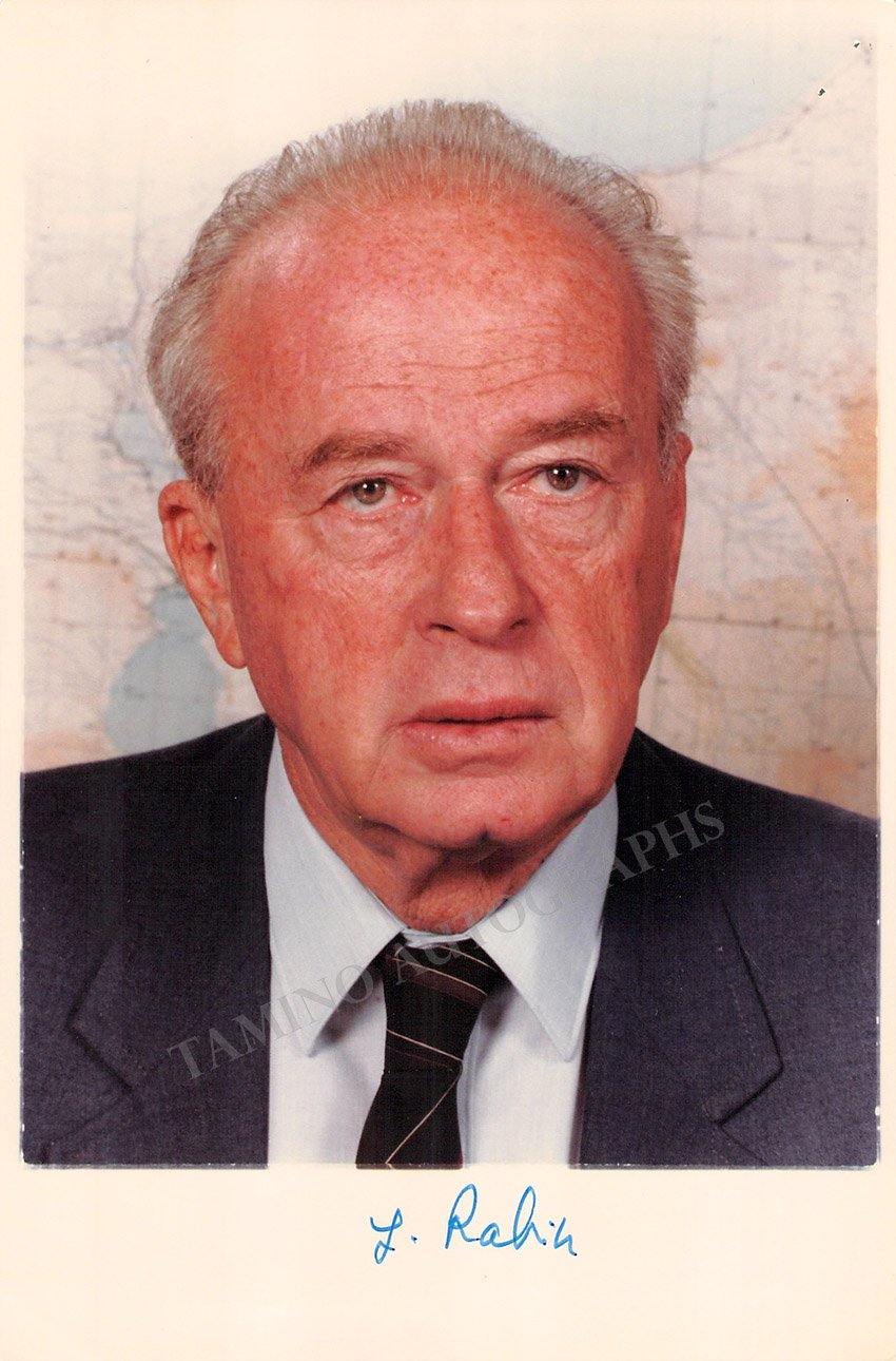 Israeli politician (1922-1995), statesman and general, who served as the fifth Prime Minister of Israel, serving two terms in office, 1974-1977 and 1992 until his assassination in 1995. Nice color photo signed by him.  Size is 5 x 7.7 inches, few clip holes over the upper-right corner, otherwise in excellent condition.