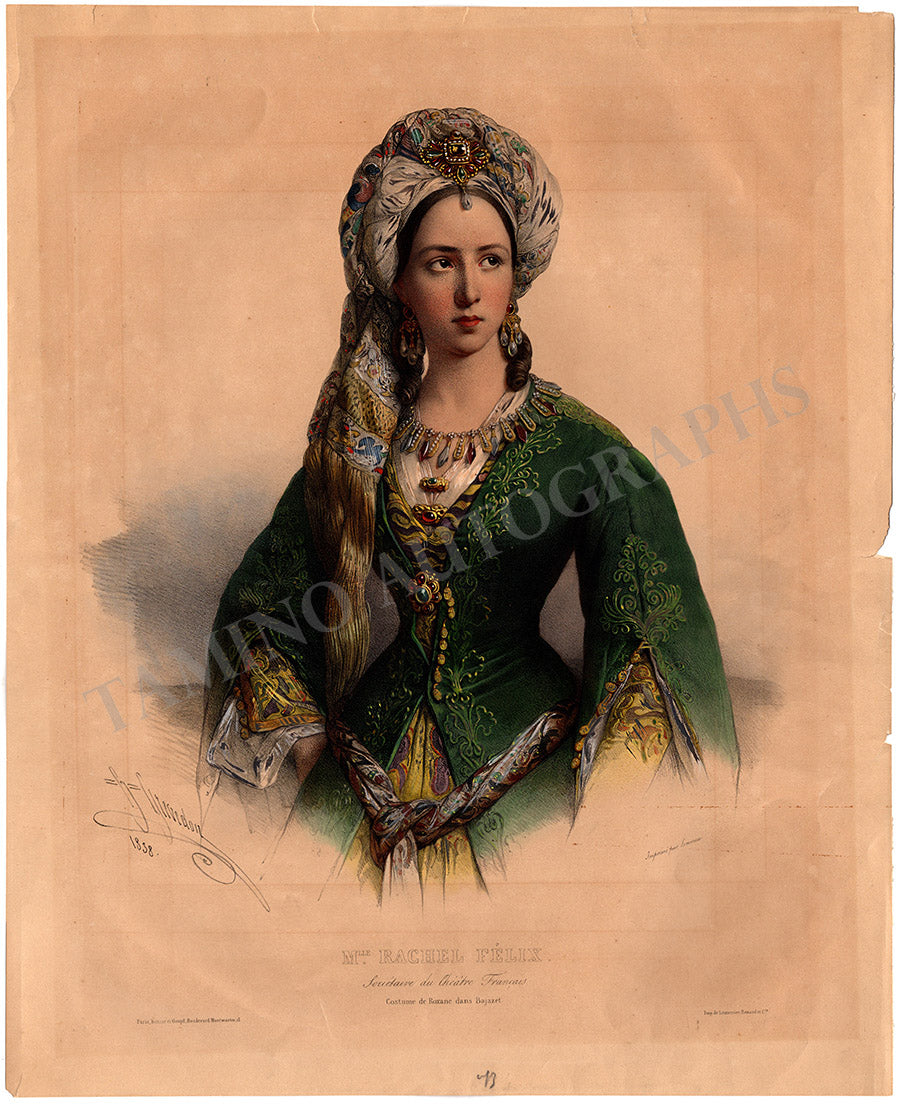 Absolutely gorgeous lithograph -an original by Ritter (Paris), depicting Felix in costume as Roxane in Jean Racine's play "Bajazet"; printed by Lemercie, and beautifully hand-colored and signed with black crayon by Henri Grevedon (1776-1860) in 1838.
