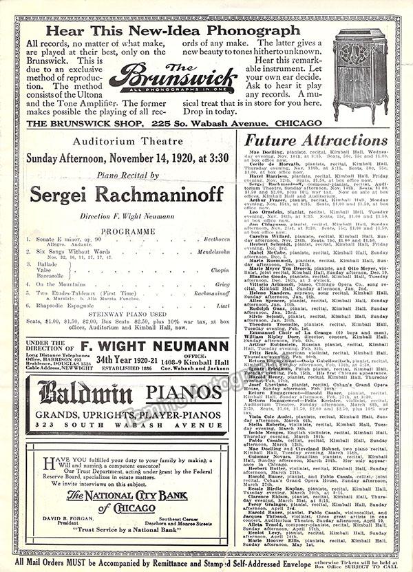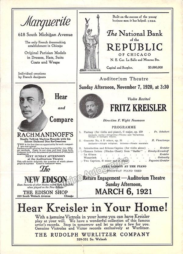 Program for a concert by the famous Russian composer and pianist in 1920. On verso a program for a concert in November 7th by violinist Kreisler. Both at the Auditorium Theater, Chicago. Size is 8.1 x 11.25 inches, 4 pages, folds, in very good condition.