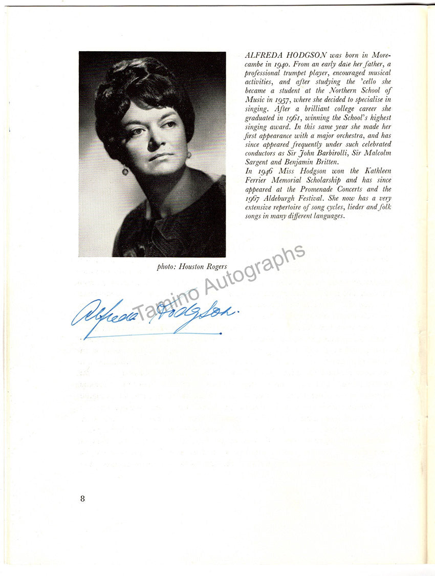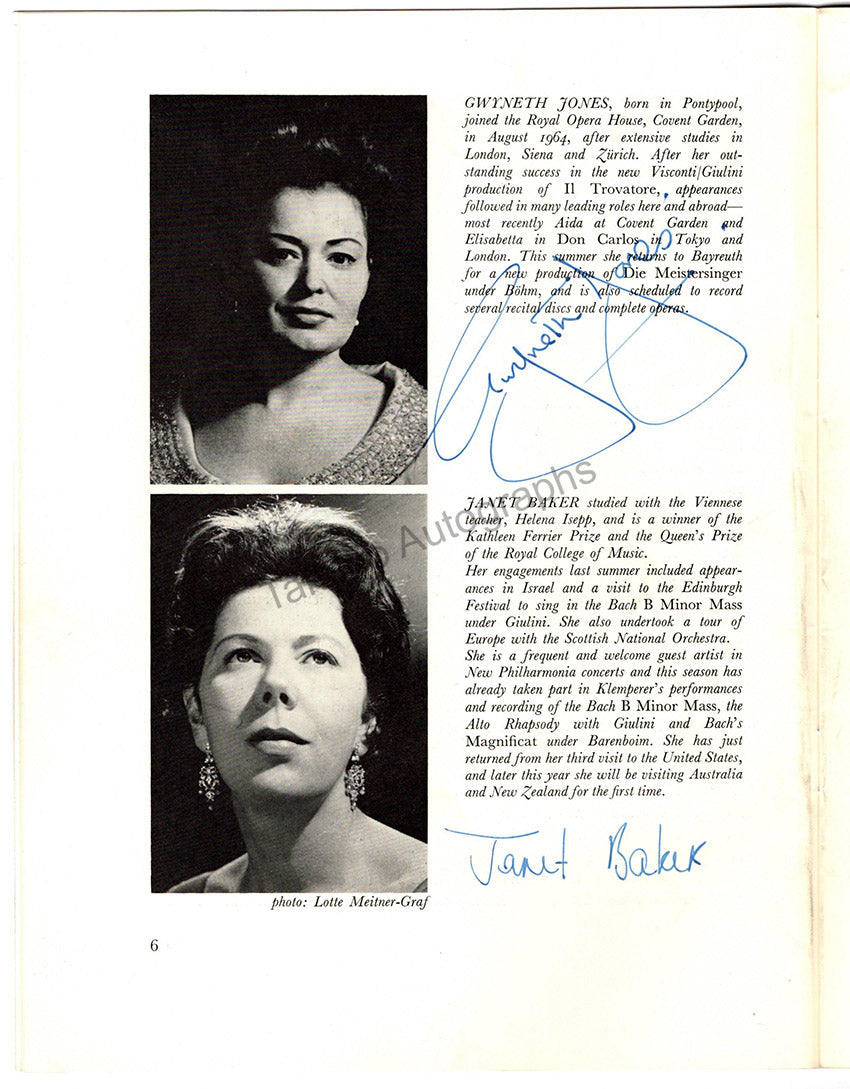Program for a performance of Mendelssohn's oratorio "Elijah" at the Royal Festival Hall, London, on June 30th, 1968, with The New Philharmonia Orchestra conducted by Rafael Frühbeck de Burgos and soloists Nicolai Gedda, Janet Baker, Gwyneth Jones, Alfreda Hogdson, and first violin Carlos Villa, signed by them all.