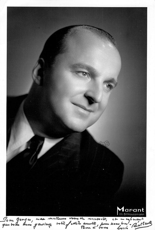 French tenor (1919-1972), signed photograph, shown as himself, inscribed with sentiment. Photo by Marant photo studio. Size is 4.75 x 7 inches, small creases on edges, otherwise in very good condition.