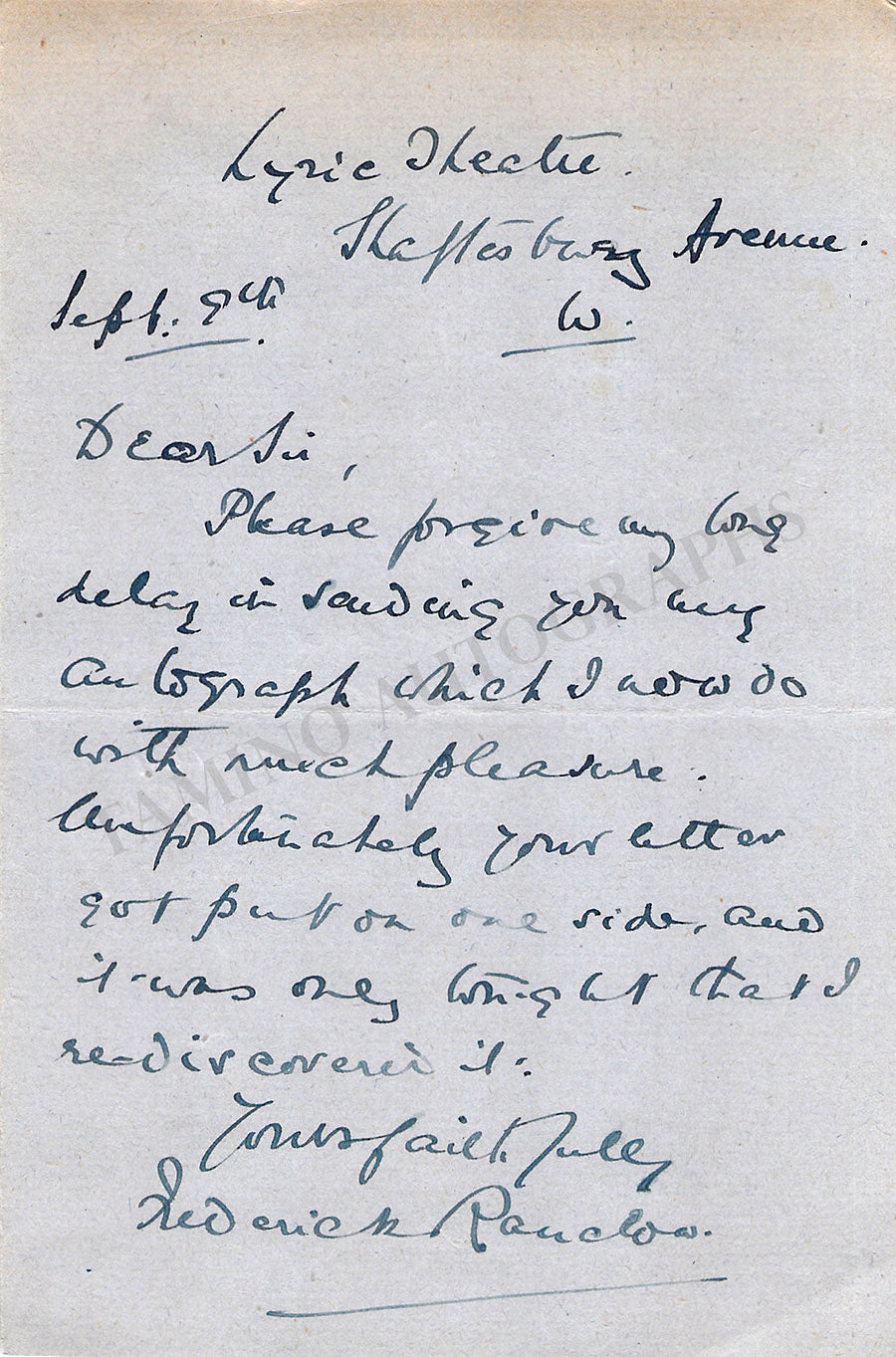 Irish bass-baritone and film actor (1873-1953), known for opera, oratorio, and musical theatre, principally associated with the role of Captain Macheath in the ballad opera The Beggar's Opera, which he sang close to 1,500 times. Autograph letter signed, 1 page in English, size is 4.5 x 6.75 inches, in excellent condition.
