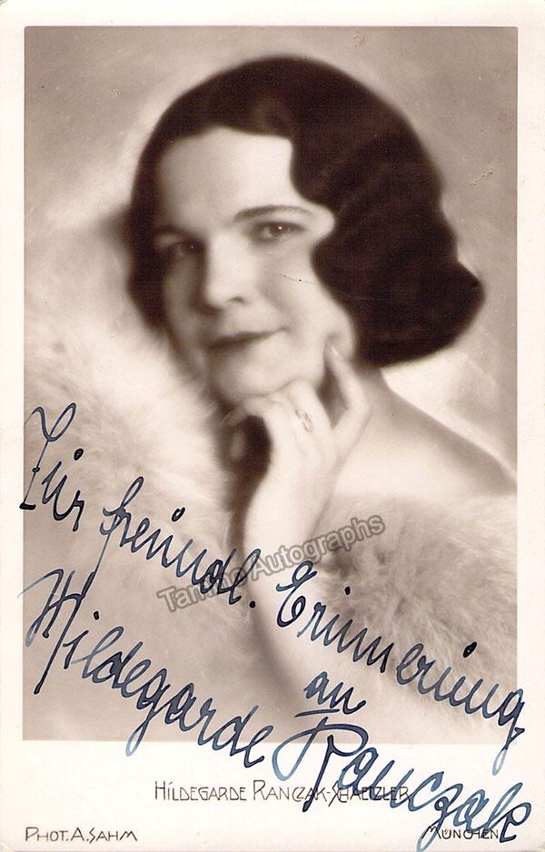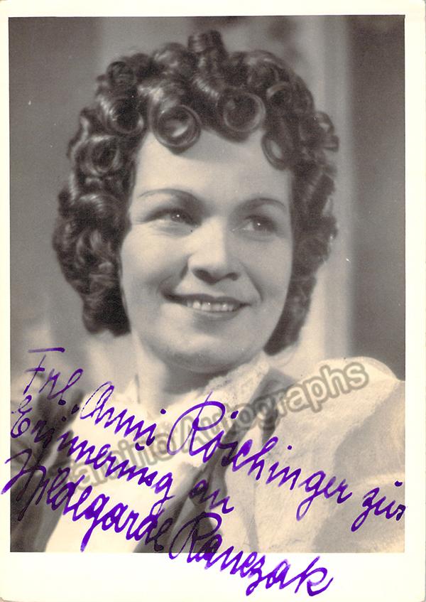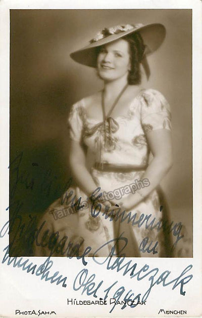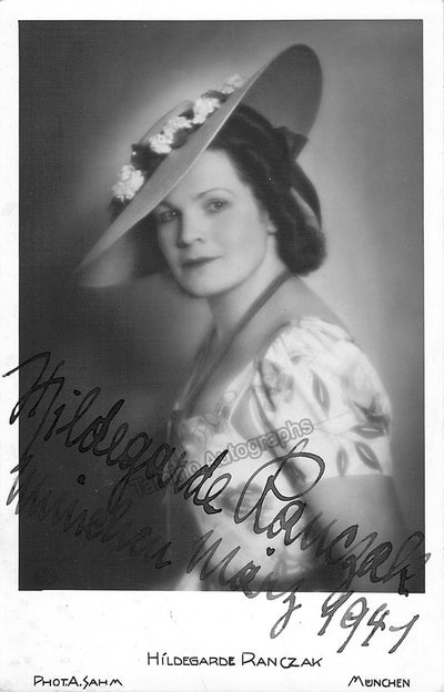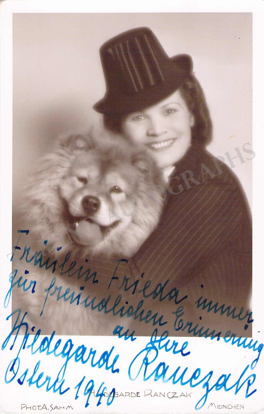 Signed postcard photograph, shown as herself, dated in 1941. Photo by A. Sahm, Munich. Size is 3.5 x 5.5 inches, in excellent condition.