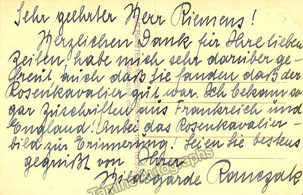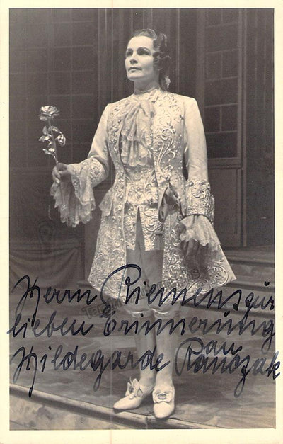 Signed photo postcard, shown as Octavian in Richard Strauss's Der Rosenkavalier, extensively inscribed to Leo Riemens on both front and verso (signature on both sides). Stamped on verso by photographer Hans Hoktt, Munich. Size is 3.5 x 5.5 inches, in excellent condition.