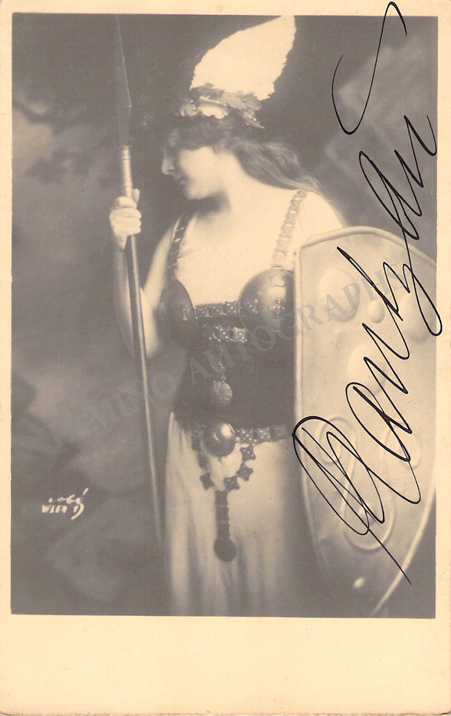 Austrian soprano, signed postcard photograph, shown in role in Wagner's Die Walkure. Size is 3.5 x 5.5 inches, in excellent condition.