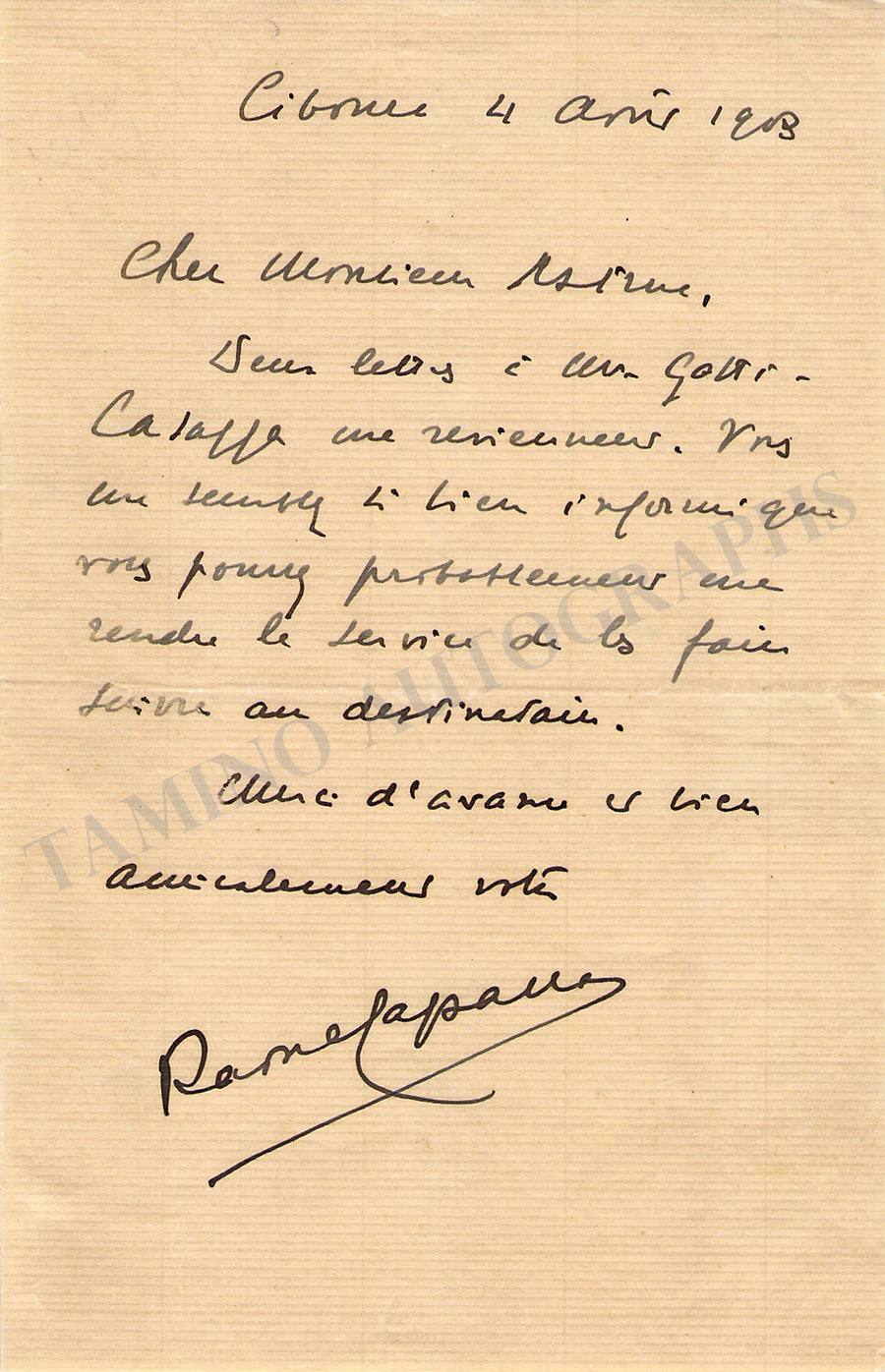 Autograph letter in French signed by him and dated April  4, 1903, to an unidentified gentleman saying that he may forward two letters for him. Laparra will win the Grand Prix de Rome in November for music composition with his Ulysse. Size is 4.4 x 6.9 inches, 1 page, folds, overall rust tone, in very good condition.