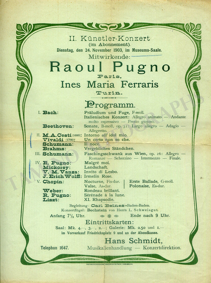 ALSO INCLUDED is a printed 1-page program for Pugno’s 24th of November 1903 concert along with Ines Maria Ferraris.